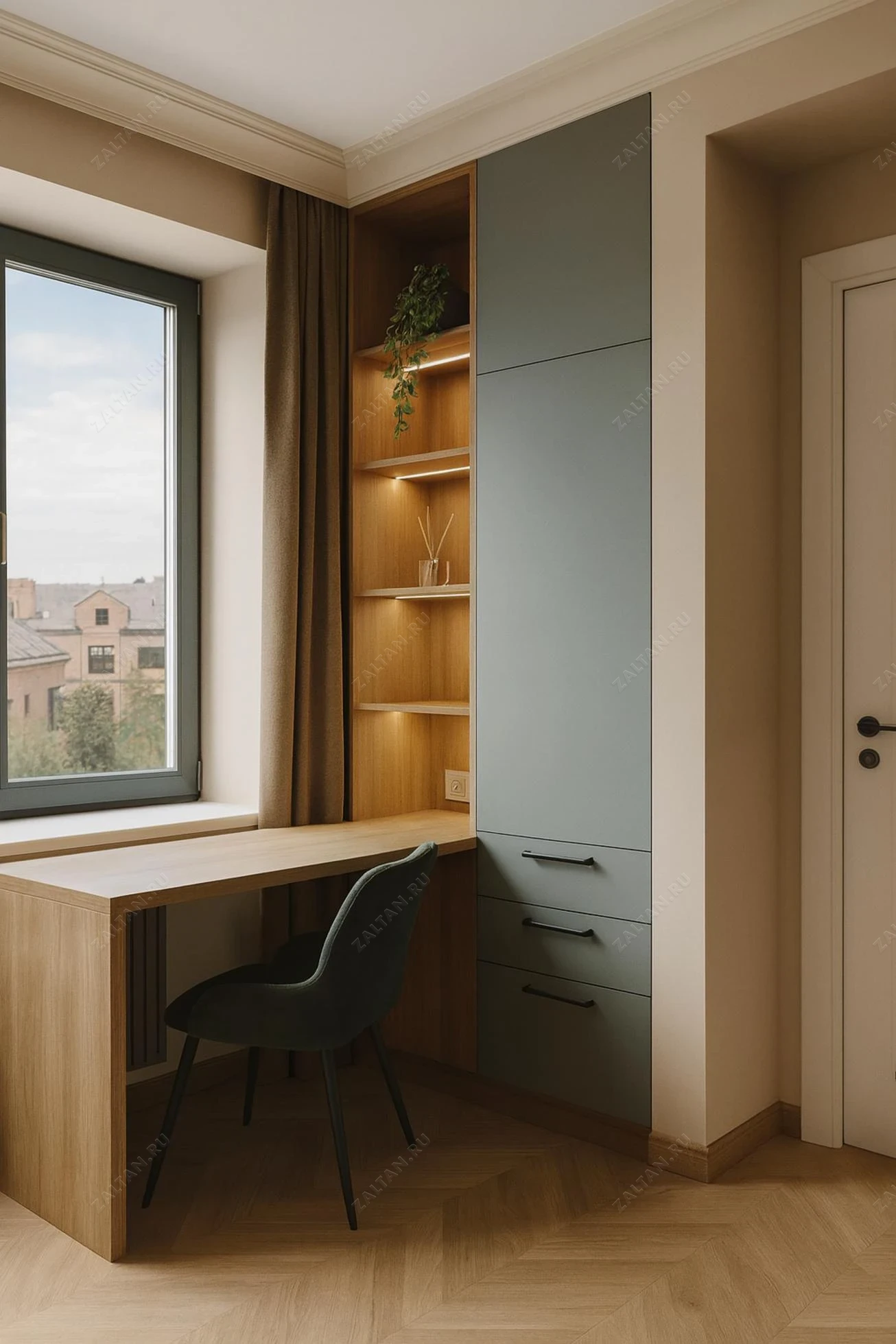 Компактная рабочая зона у окна с встроенным пеналом — элегантное решение на заказ для современного интерьера. Каркас оформлен под дубовый шпон, фасады в спокойном зелёном оттенке из матового МДФ. Встроенные открытые полки с подсветкой, столешница у окна и три глубоких выдвижных ящика для аккуратного хранения.