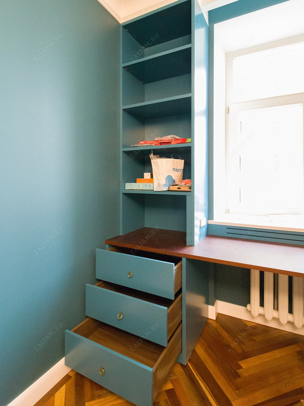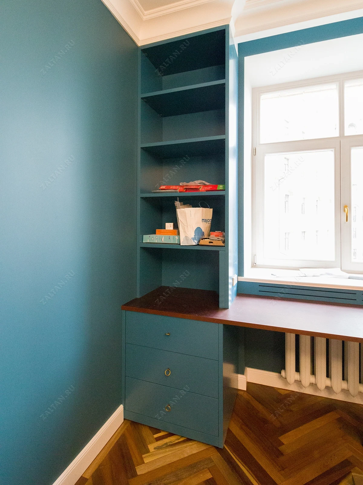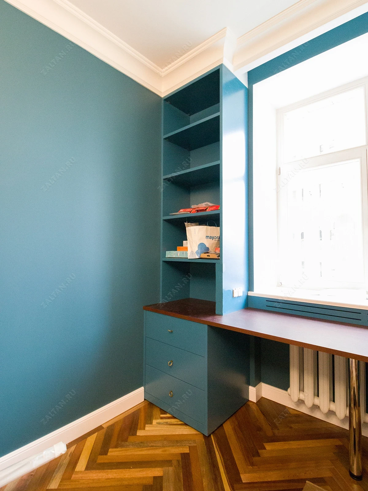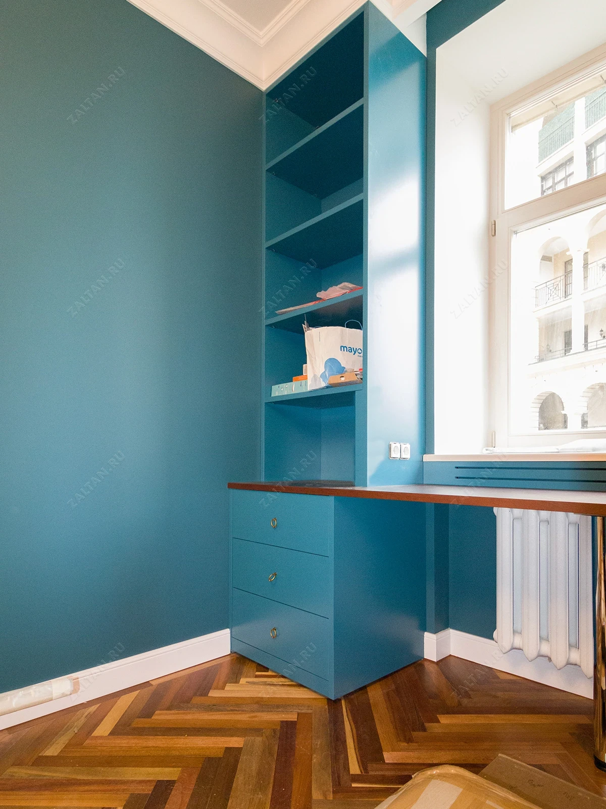 Рабочее место Мароа в детской комнате сочетает в себе функциональность и стильный дизайн. Глубокий синий цвет стеллажей и стола, расположенных по бокам от окна, создает атмосферу сосредоточенности и покоя, способствуя умственной работе. Стеллажи с полками различных размеров идеально подходят для хранения книг, учебных материалов и творческих принадлежностей, в то время как выдвижные ящики стола обеспечивают дополнительное место для канцелярских принадлежностей и личных вещей ребенка.