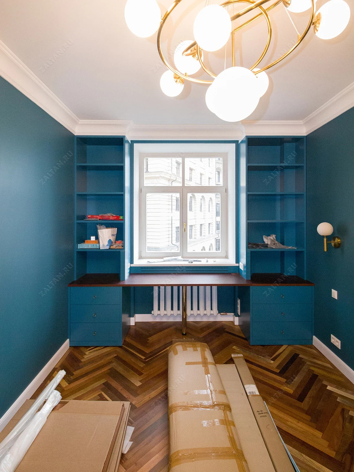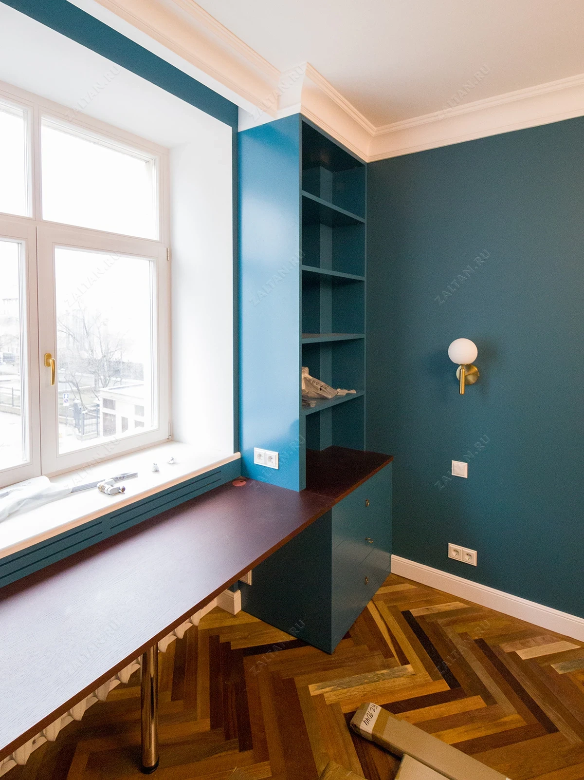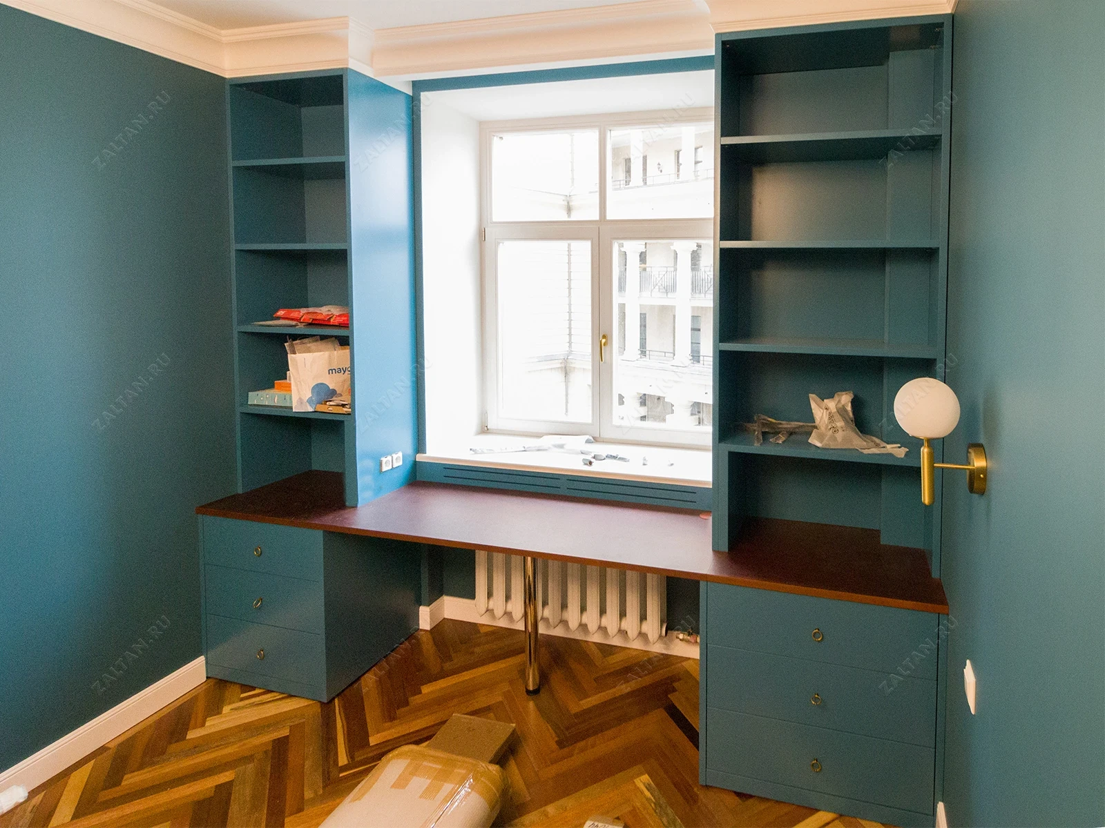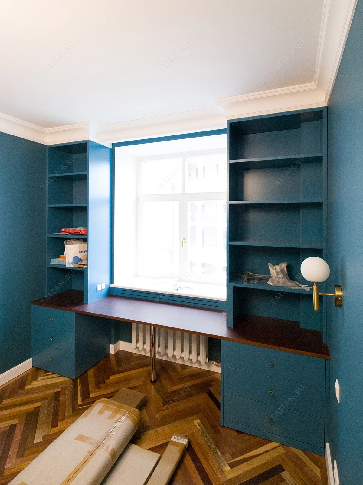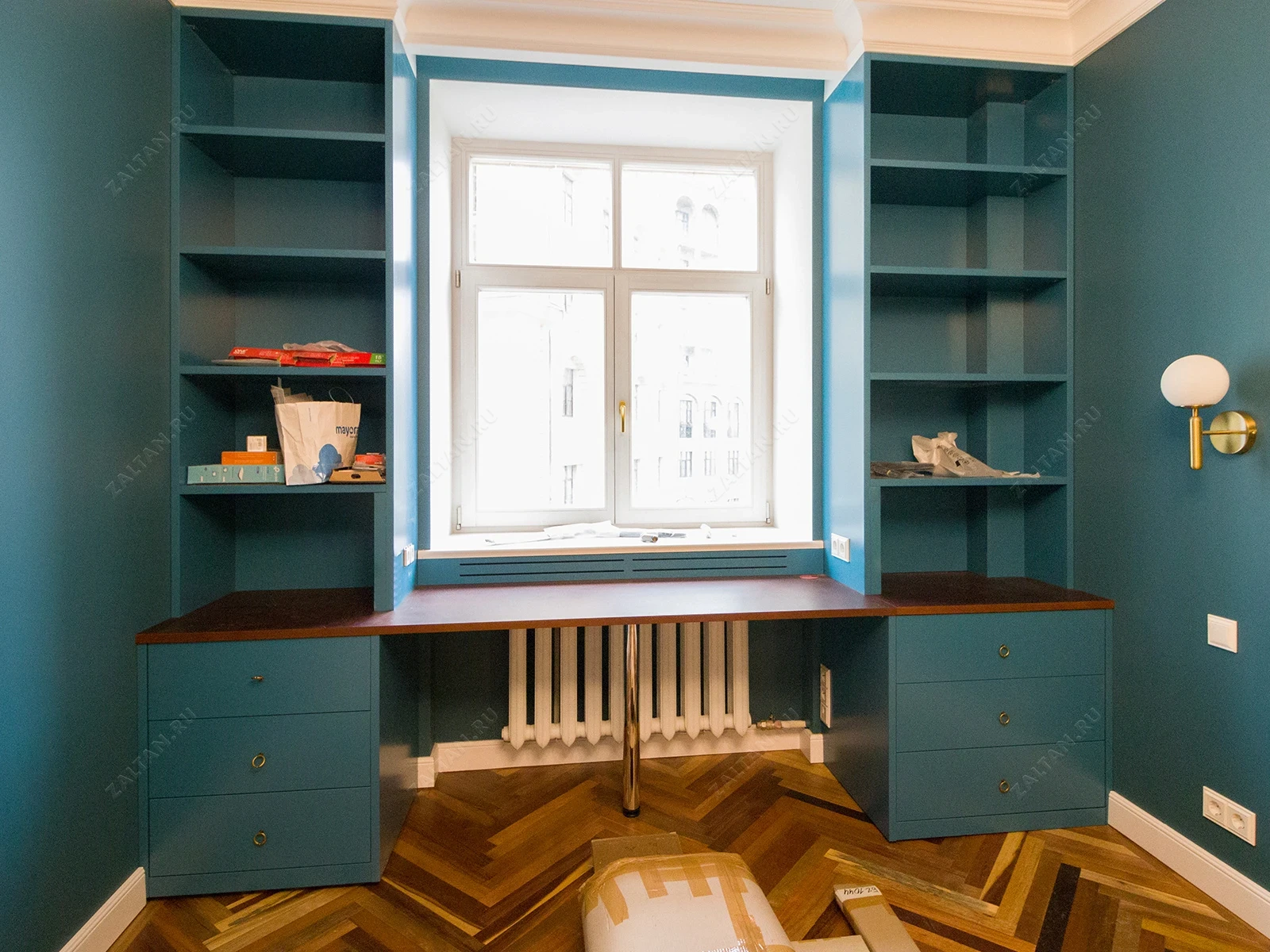 Рабочее место Мароа в детской комнате сочетает в себе функциональность и стильный дизайн. Глубокий синий цвет стеллажей и стола, расположенных по бокам от окна, создает атмосферу сосредоточенности и покоя, способствуя умственной работе. Стеллажи с полками различных размеров идеально подходят для хранения книг, учебных материалов и творческих принадлежностей, в то время как выдвижные ящики стола обеспечивают дополнительное место для канцелярских принадлежностей и личных вещей ребенка.
