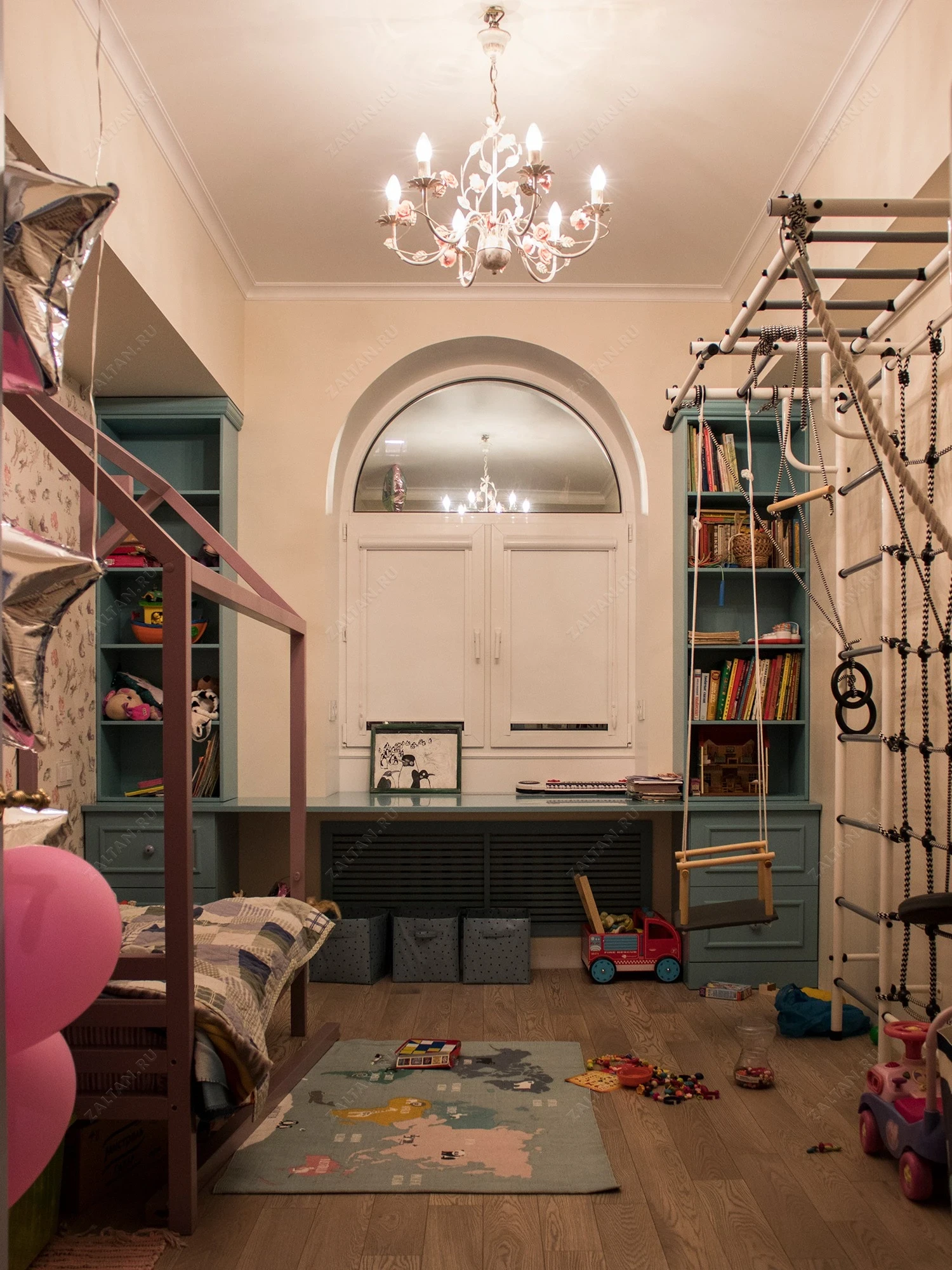 Рабочее место Саурис организовано вокруг окна в детской комнате. Это решение не только оптимизирует использование пространства, но и обеспечивает достаточно естественного света для учебы и творчества. Мебель включает в себя рабочий стол вдоль подоконника и книжные стеллажи по бокам от окна, выполненные из МДФ и окрашенные в спокойный синий цвет эмалью, что добавляет интерьеру яркости и создаёт умиротворяющую атмосферу.