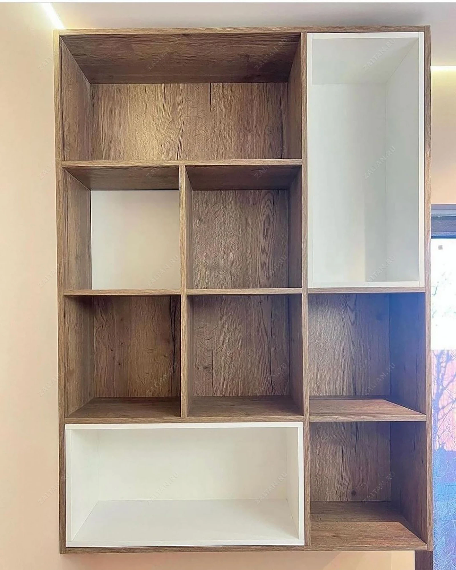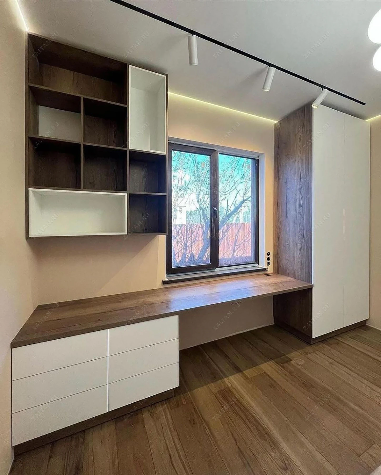 Стиль мебели скандинавский - сочетание белого и двересного оттенков. Корпус выполнен из ЛДСП 16мм с текстурой дерева, фасады выкрашены в белый матовый цвет RAL 9003. Ящики в тумбах с доводчиками скрытого монтажа. Стеллаж под книги также из двух цветов. Минималистичное исполнение, современный стиль.