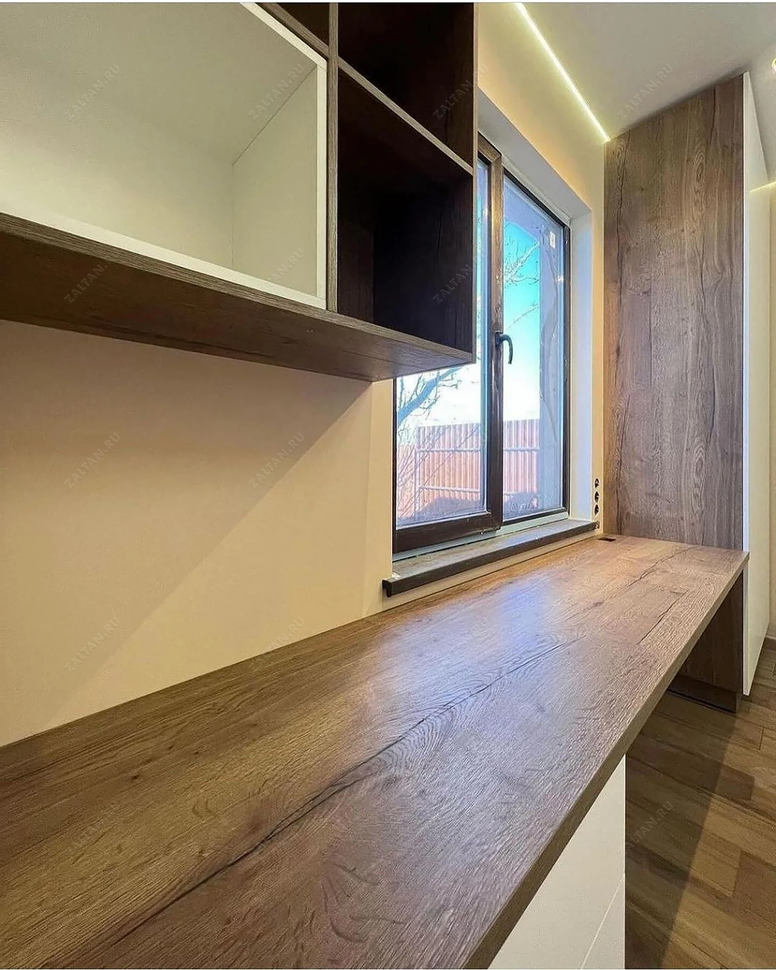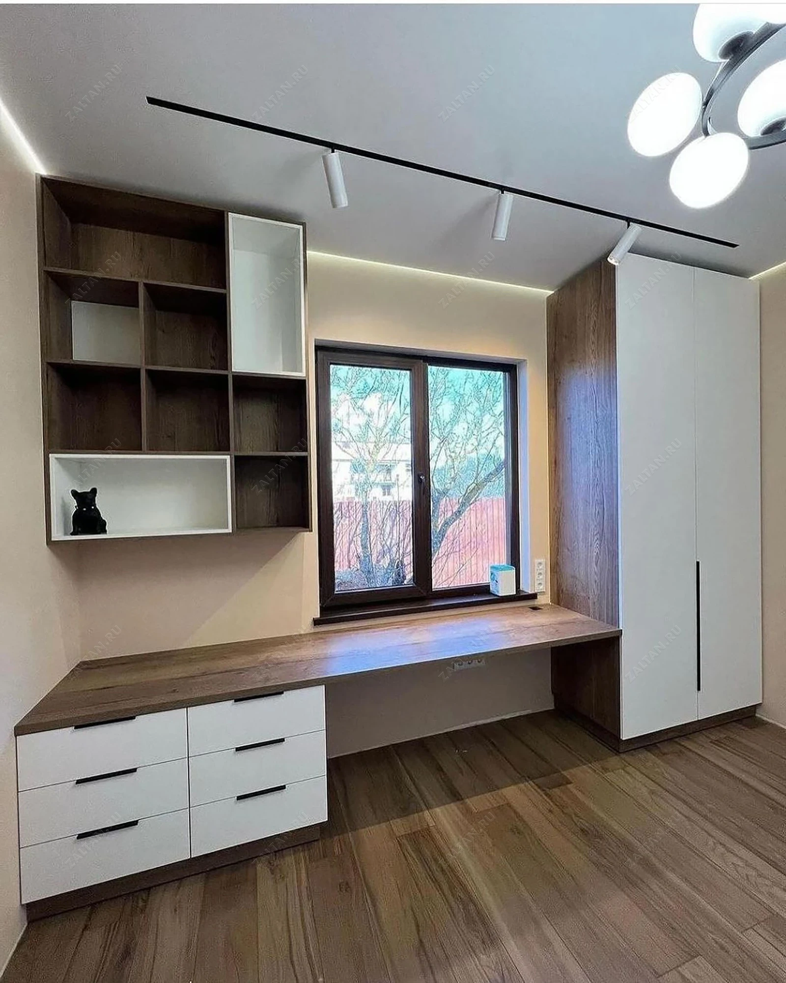 Для детской комнаты мальчика подростка был изготовлен комплект мебели по индивидуальным размерам - двустворчатый шкаф и рабочее место у окна. Рабочая зона имеет две тумбы с 6 ящиками, и подвесной стеллаж. Столешница по всей длинне до шкафа. Мебель корпусная установлена от стены до стены и под потолок.