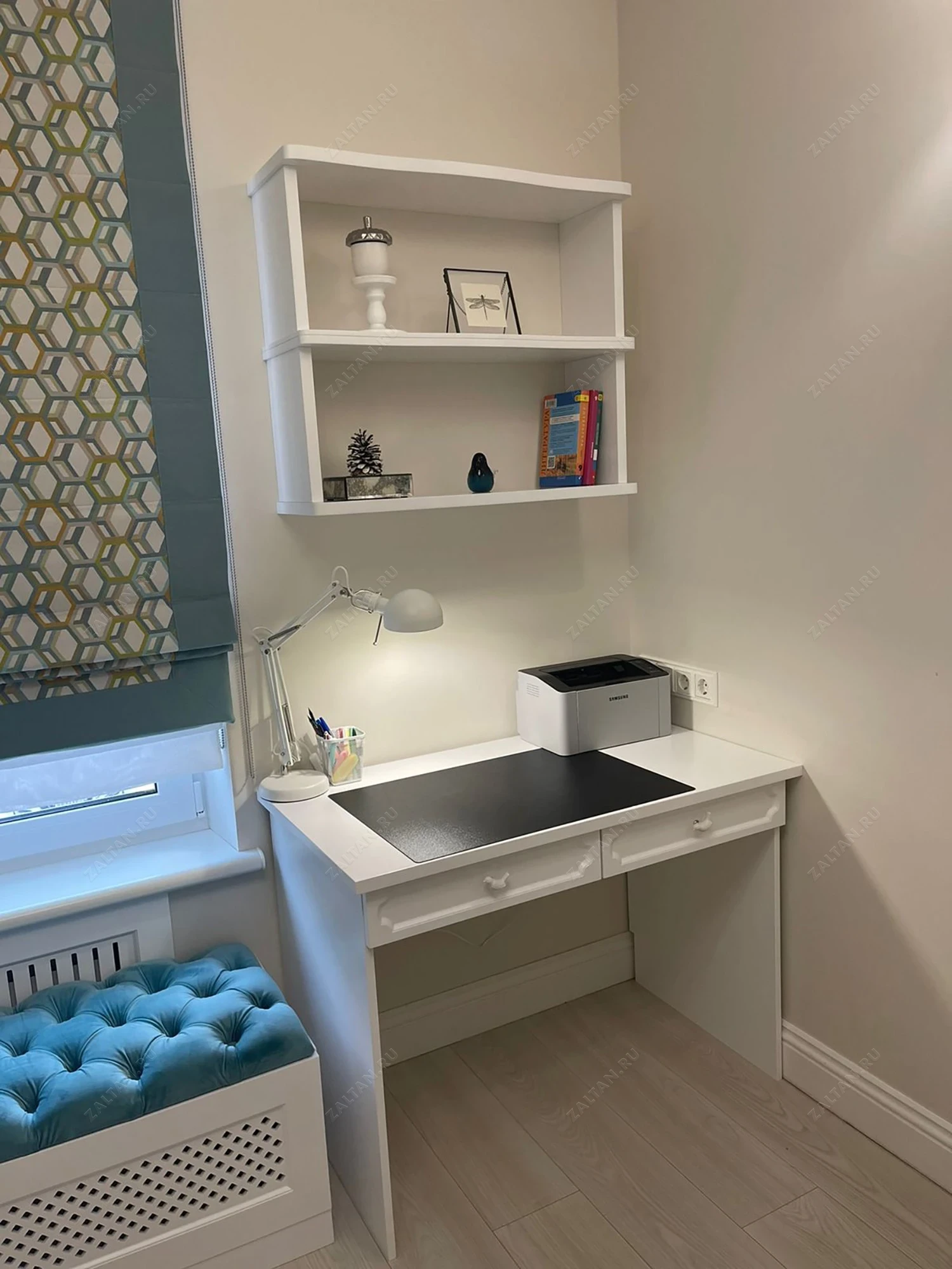 Функциональный рабочий стол "Поинт" для детской комнаты, оснащённый удобными ящиками и подвесным открытым шкафом. Стол и шкаф выполнены в едином стиле, что создаёт гармоничный и спокойный интерьер. Белый цвет мебели вносит в комнату свет и визуально расширяет пространство, а прямые линии подчёркивают современный и минималистичный дизайн.