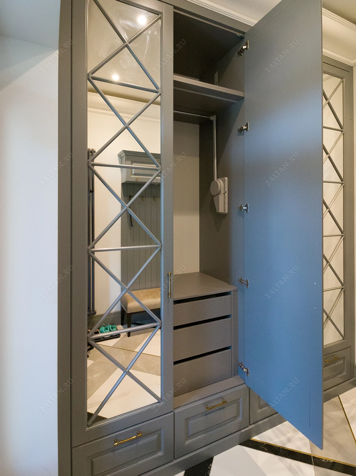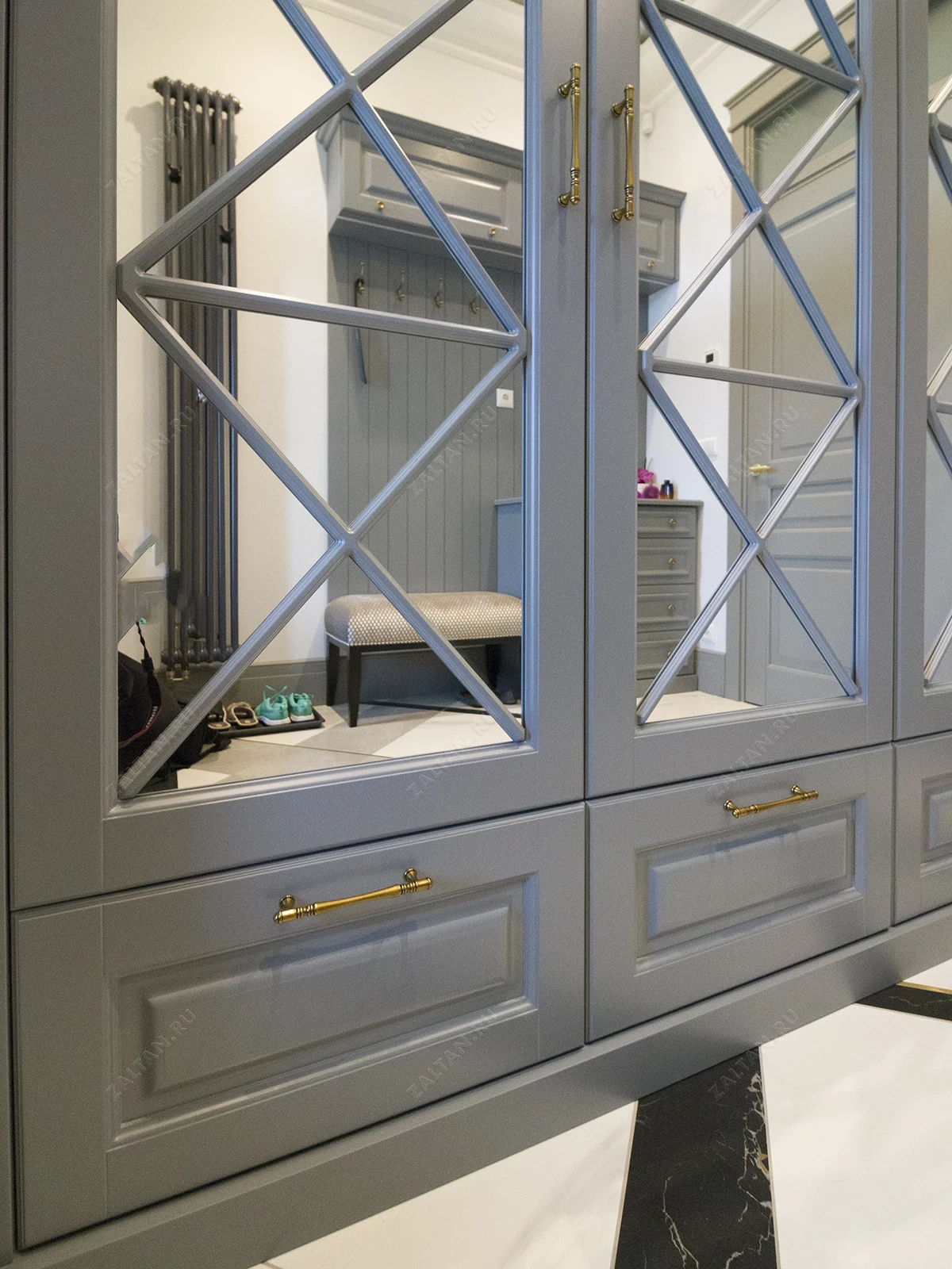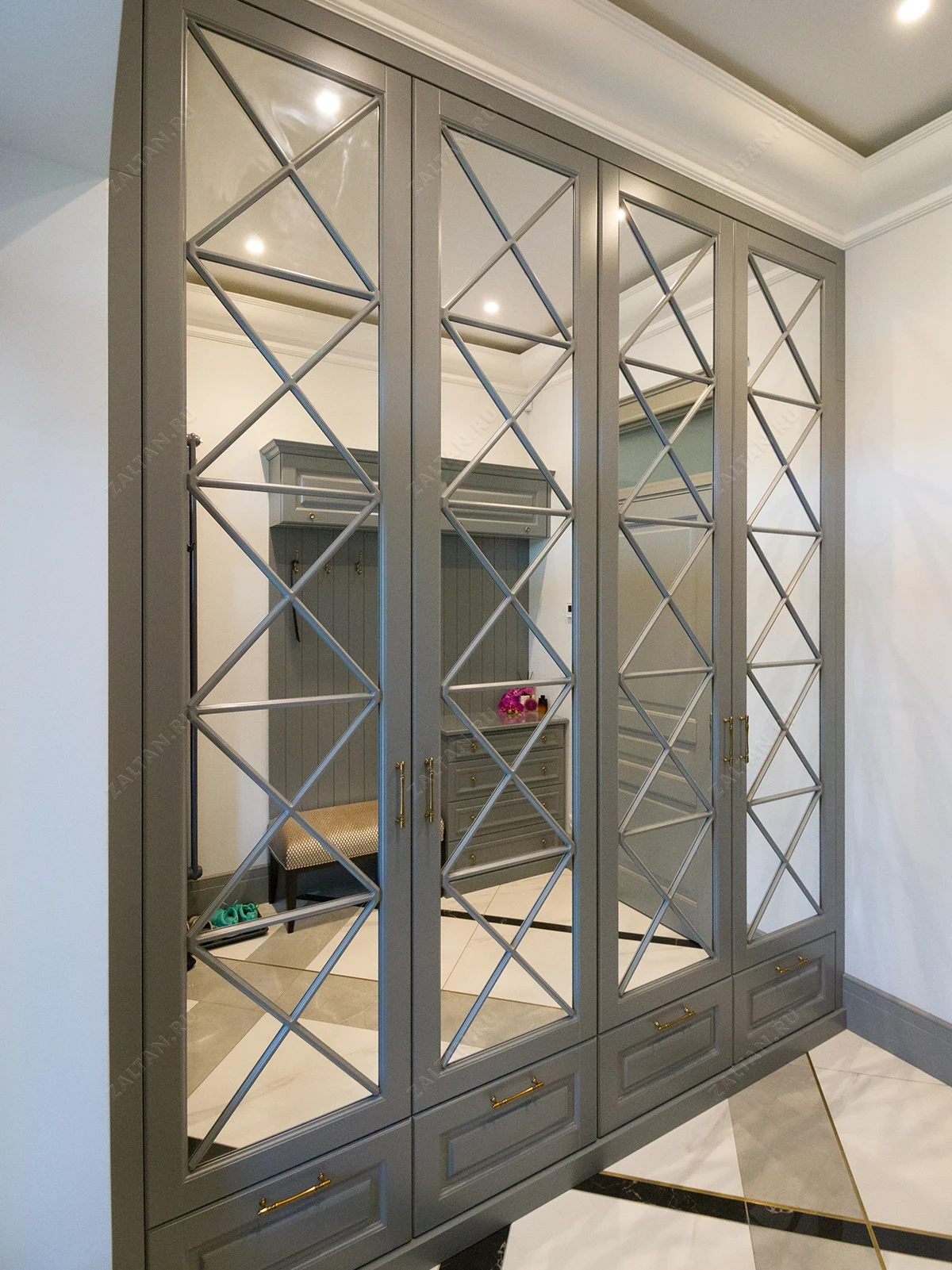 Шкаф в нишу прихожей из крашеного МДФ в эмали с зеркальными фасадами и декоративной раскладкой в форме "Перекрестий". Выполняется на заказ под индивидуальные размеры заказчика, наполнение также может быть любым. В данном проекте шкаф был изготовлен под потолок, нижний ряд под обувь с ящиками. Фасады фрезерованные покрытые эмалью серого цвета. Внутри установлены лифты/пантографы для одежды и внутренние ящики под бельё.