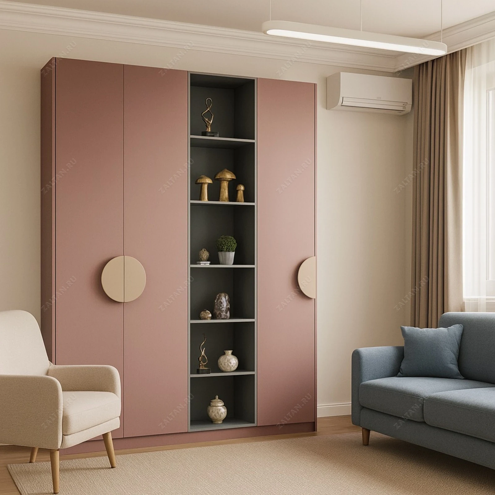 Распашной шкаф высотой 2400 мм с открытой центральной нишей — стильное и функциональное решение для гостиной. Матовая фактура фасадов в розовом тоне сочетается с графитовой внутренней отделкой и крупными интегрированными круглыми ручками.