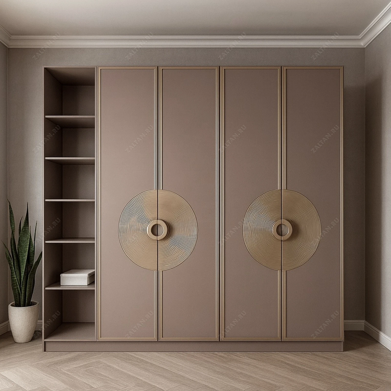 Элегантный корпусный распашной шкаф премиум-класса с открытой секцией полок. Идеально подходит для спальни и прихожей, выполняется по индивидуальным размерам под потолок.