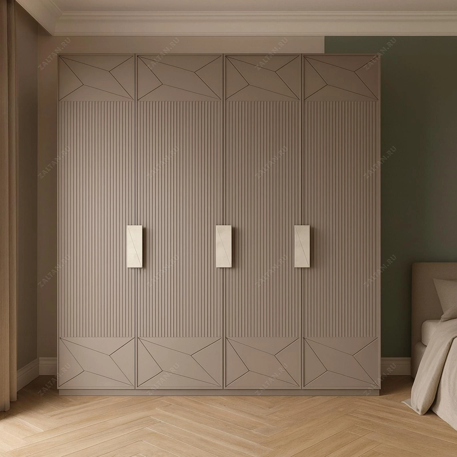 Элегантный распашной шкаф премиум-класса с вертикальной реечной фактурой и геометрическими панелями в верхней и нижней части фасада. Цвет — мягкий бежево-песочный матовый тон. Ручки — крупные прямоугольные накладки светлого оттенка, контрастные по текстуре.