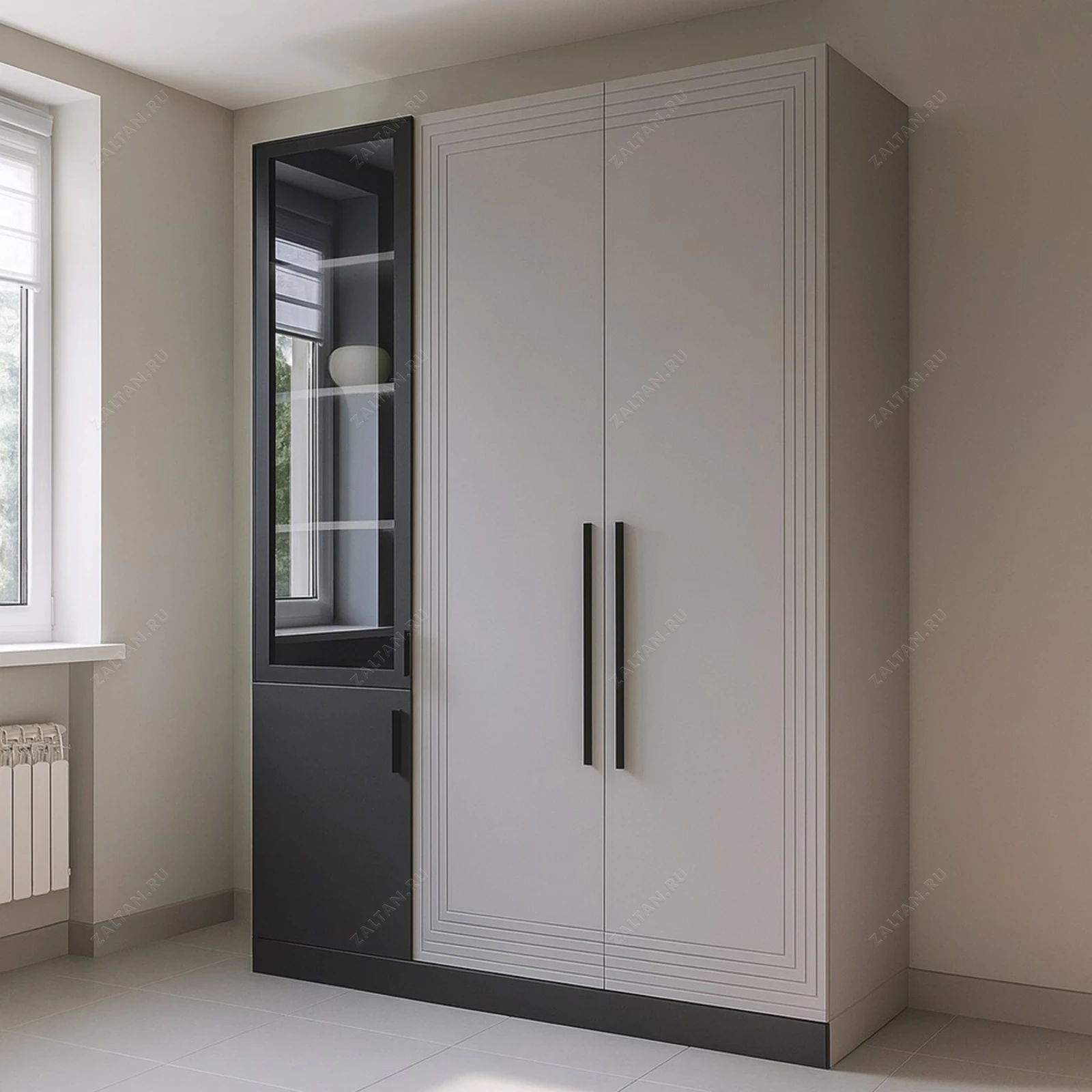 Распашной шкаф с витриной — решение для тех, кто ценит премиальное исполнение и функциональность. Фасады из МДФ в матовой отделке сочетаются с чёрной витринной секцией со стеклянными полками. Продуманное внутреннее наполнение подходит для одежды, белья и аксессуаров.