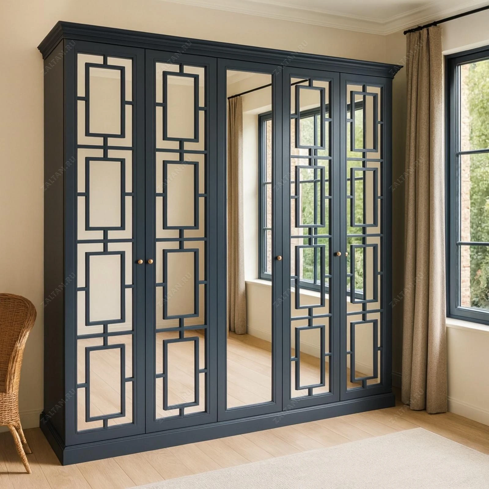 Элегантный распашной шкаф на заказ в неоклассическом стиле. Корпус из МДФ с декоративной фрезеровкой и зеркальными вставками, аккуратные латунные ручки и классический карниз. Выполняется под точные замеры, удобная внутренняя планировка для одежды и аксессуаров.