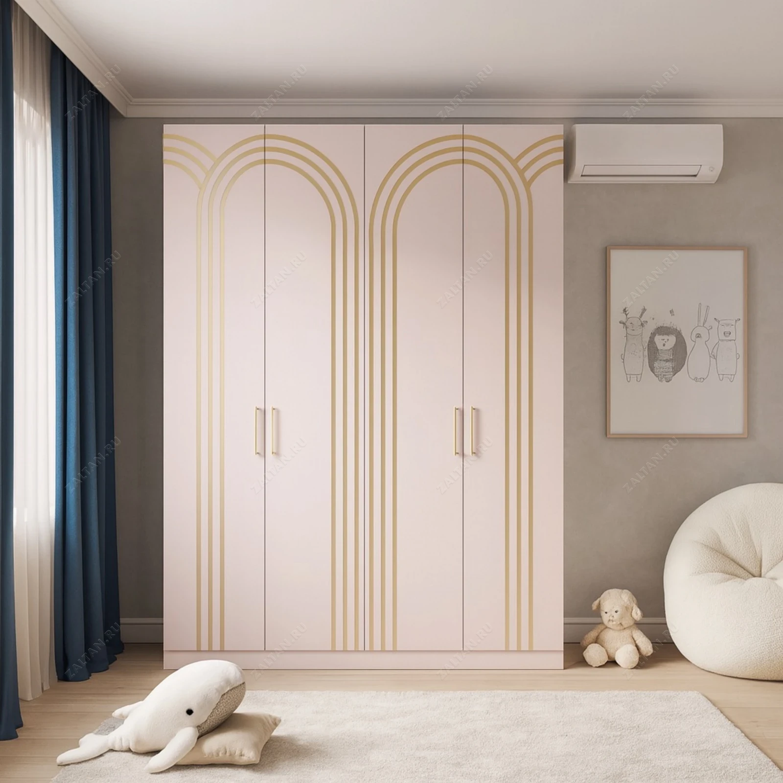 Элегантный корпусный распашной шкаф под заказ — решение для детской или спальни с акцентом на премиум‑отделку. Фасад из МДФ с матовой эмалью и золотистой графикой создает лёгкий и стильный образ.