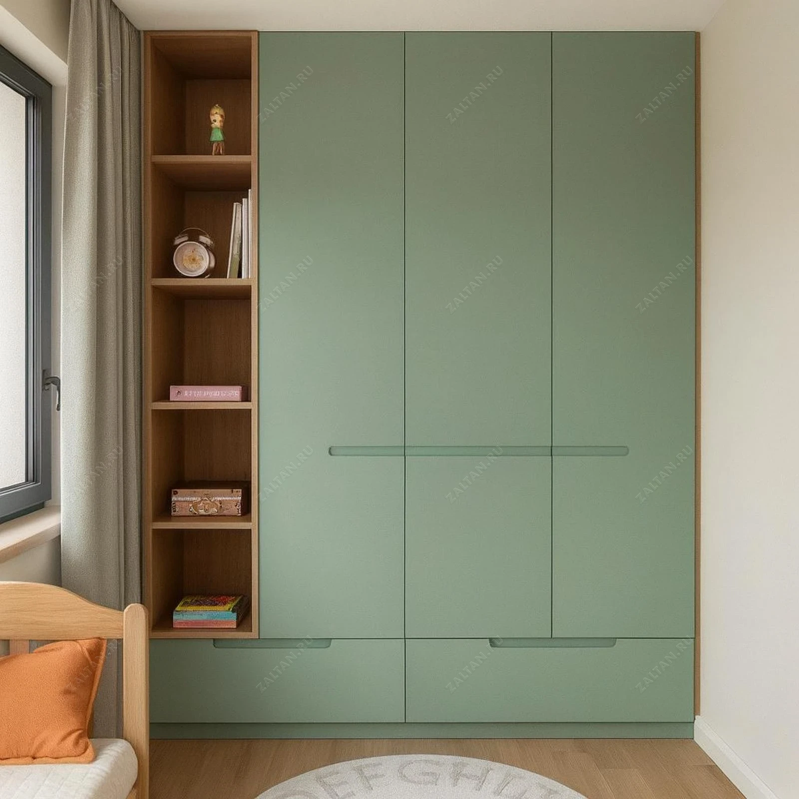 Элегантный корпусный шкаф по индивидуальным размерам: матовые зелёные фасады из МДФ и открытый пенал со шпоном. Решение для детской или спальни с врезными ручками, двумя нижними ящиками и продуманной внутренней организацией.