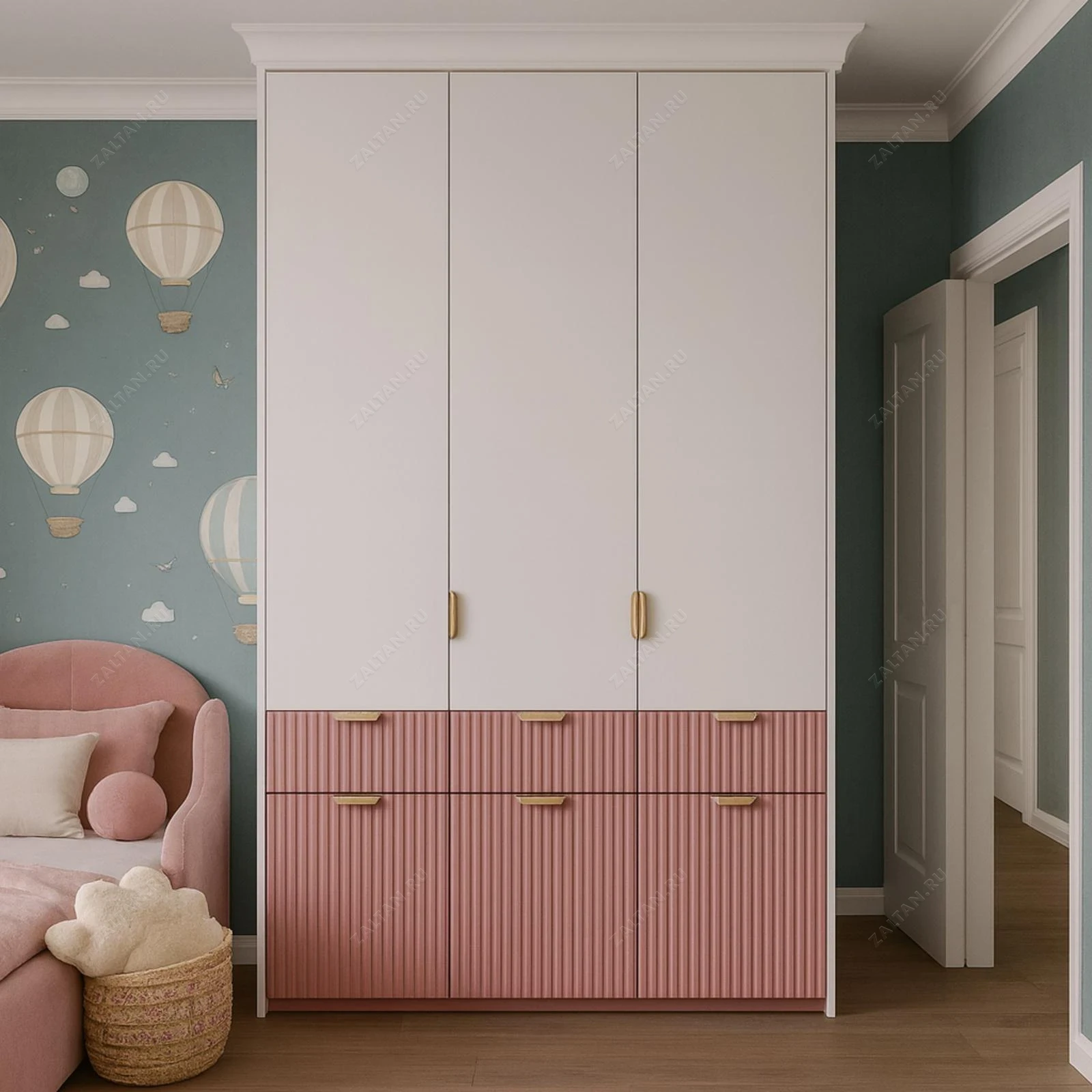 Стильный корпусный распашной шкаф премиум-класса, выполнен под потолок. Верхние дверцы — ровная матовая поверхность светлого тона, нижние секции — рифлёные фасады в розовом цвете. Небольшие золотистые ручки и карниз добавляют неоклассического акцента.