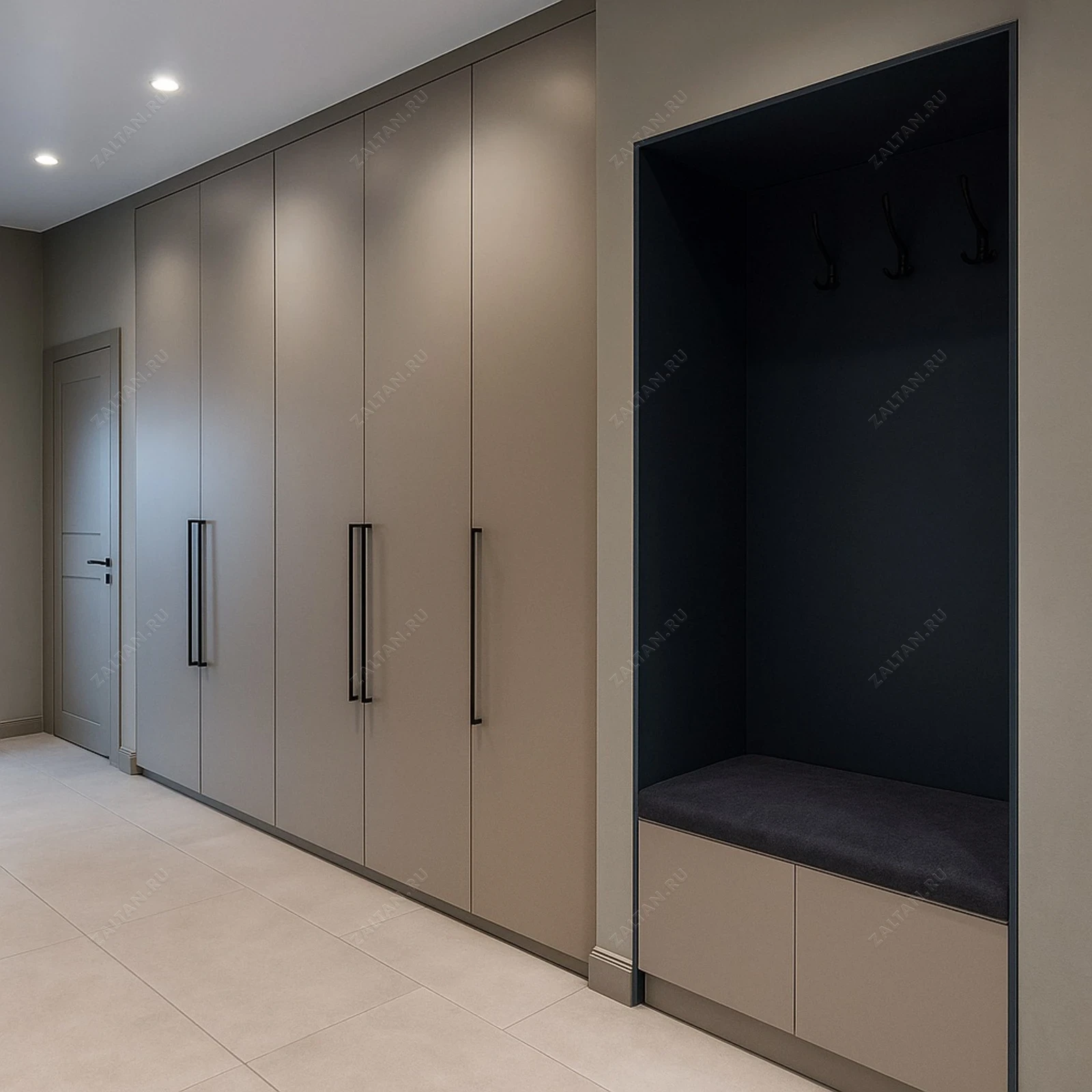 Встроенный распашной шкаф для прихожей в минималистичном стиле. Матовые фасады, длинные черные ручки и ниша с банкеткой обеспечивают аккуратный и функциональный входной гарнитур.