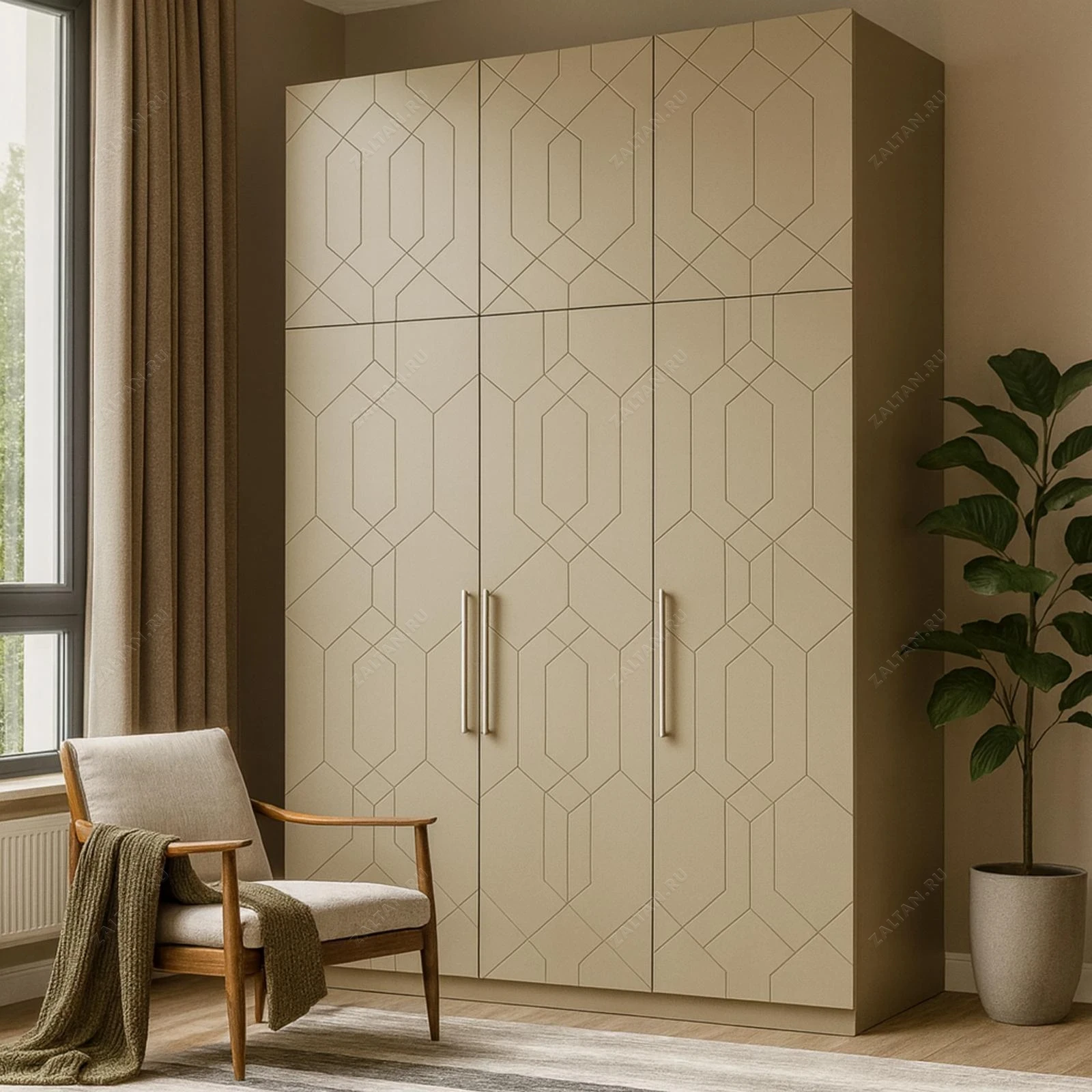 Высокий платяной шкаф с антресолями и фрезерованными фасадами — решение для тех, кто ценит премиальную отделку и аккуратные геометрические узоры. На фото — трёхдверная секция с верхними шкафчиками, длинными вертикальными ручками и матовой эмалевой поверхностью в тёплом кремовом оттенке.