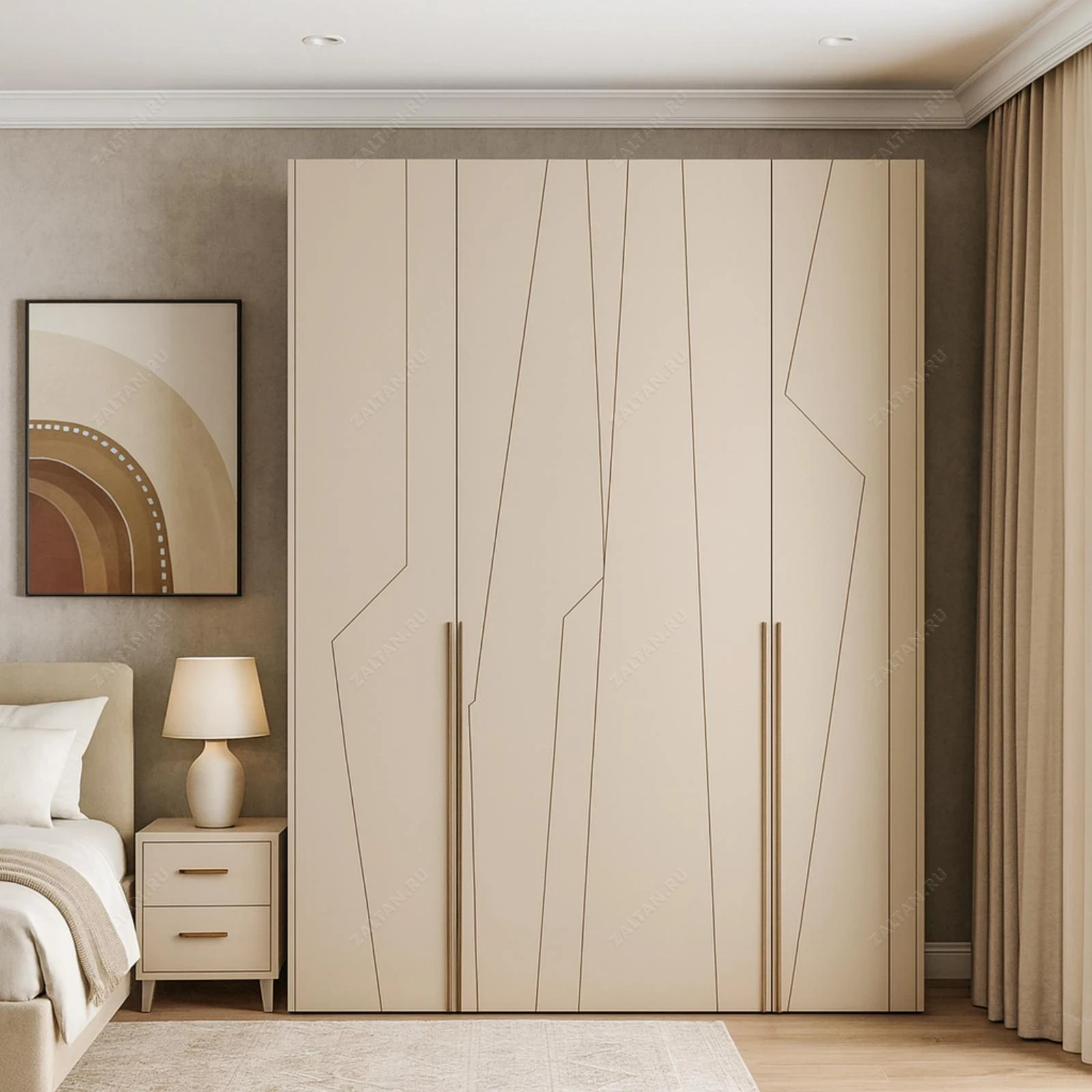 Распашной шкаф премиум-класса в тёплом кремовом оттенке. Характерная особенность — фрезерованный геометрический рисунок на фасадах и длинные металлические ручки, подчёркивающие вертикальную композицию.