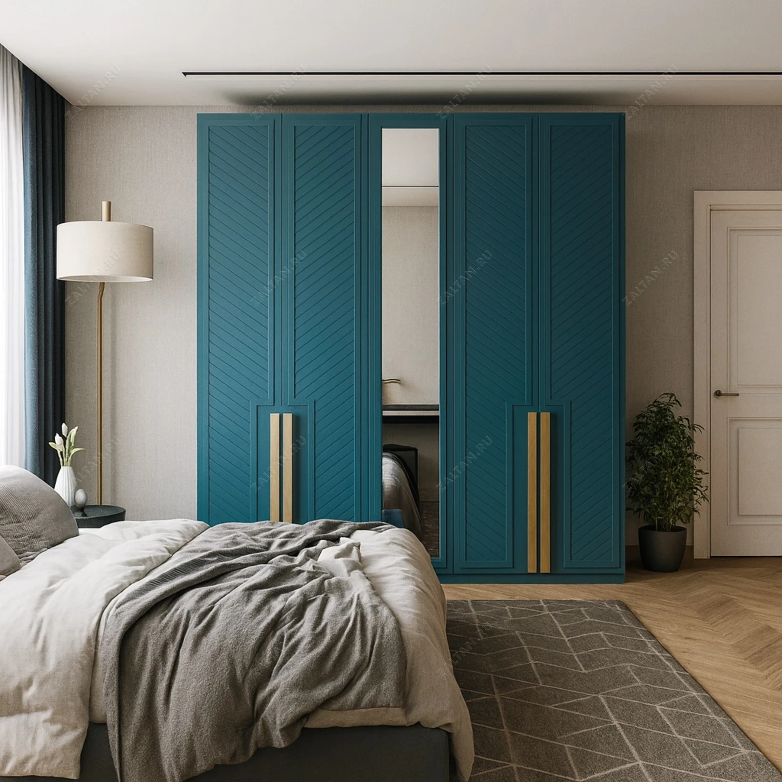 Элегантный распашной шкаф премиум-класса, выполненный по индивидуальным размерам. Фасады с диагональной фрезеровкой и глубоким матовым оттенком придают мебели выразительность, а узкая зеркальная вставка увеличивает пространство комнаты.