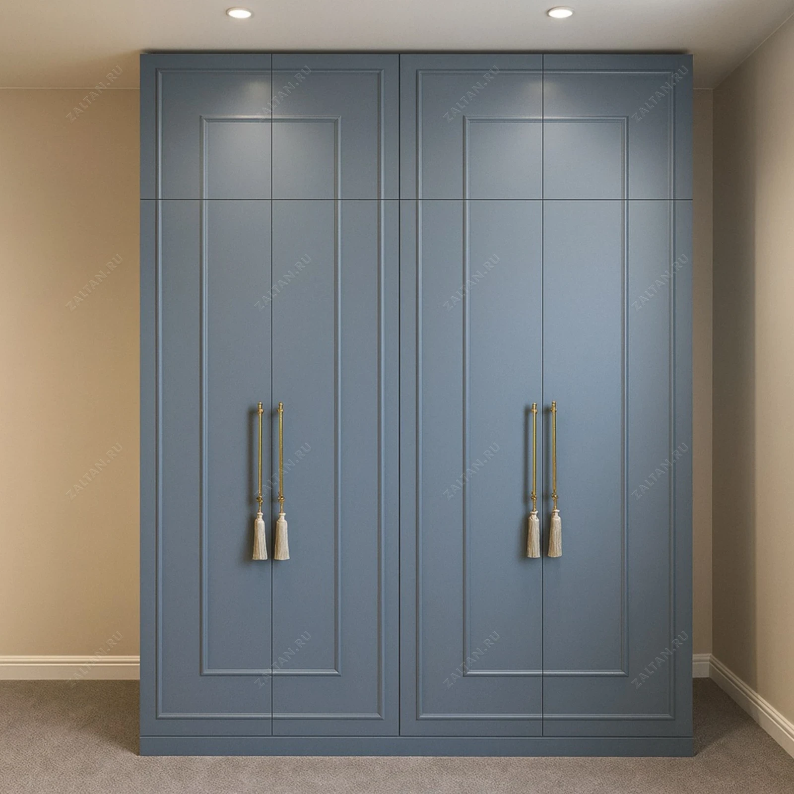 Элегантный распашной шкаф в неоклассическом стиле, окрашенный в глубокий синий матовый цвет. Фасады — фрезерованный МДФ с эмалью, декоративная раскладка придаёт объем и статус. Длинные латунные ручки с кистями подчёркивают премиум‑характер.