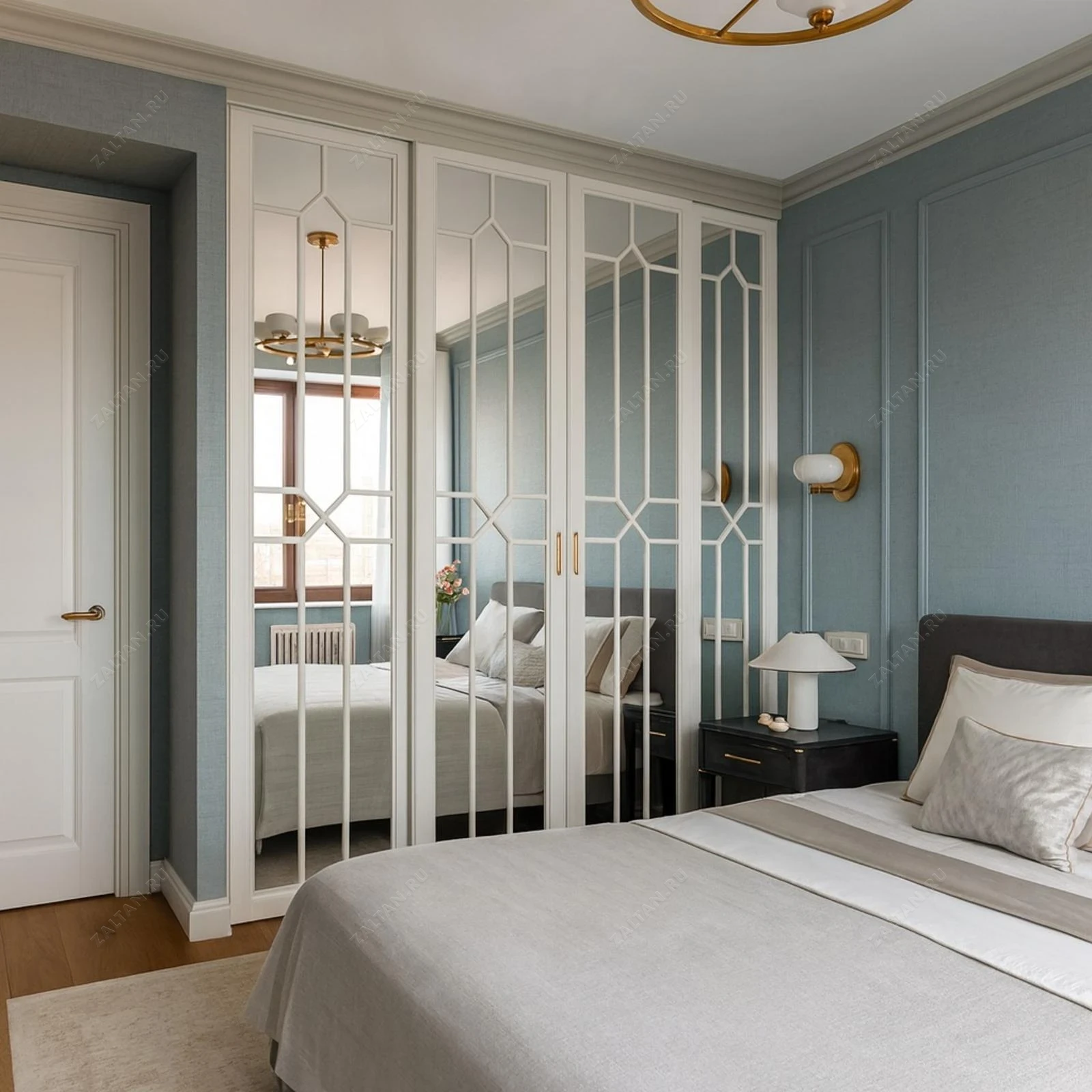 Элегантный встроенный распашной шкаф для спальни с зеркальными дверями и декоративной раскладкой. Дизайн в неоклассическом ключе: молдинги, тонкие золотые ручки и аккуратная верхняя планка создают премиальный образ.