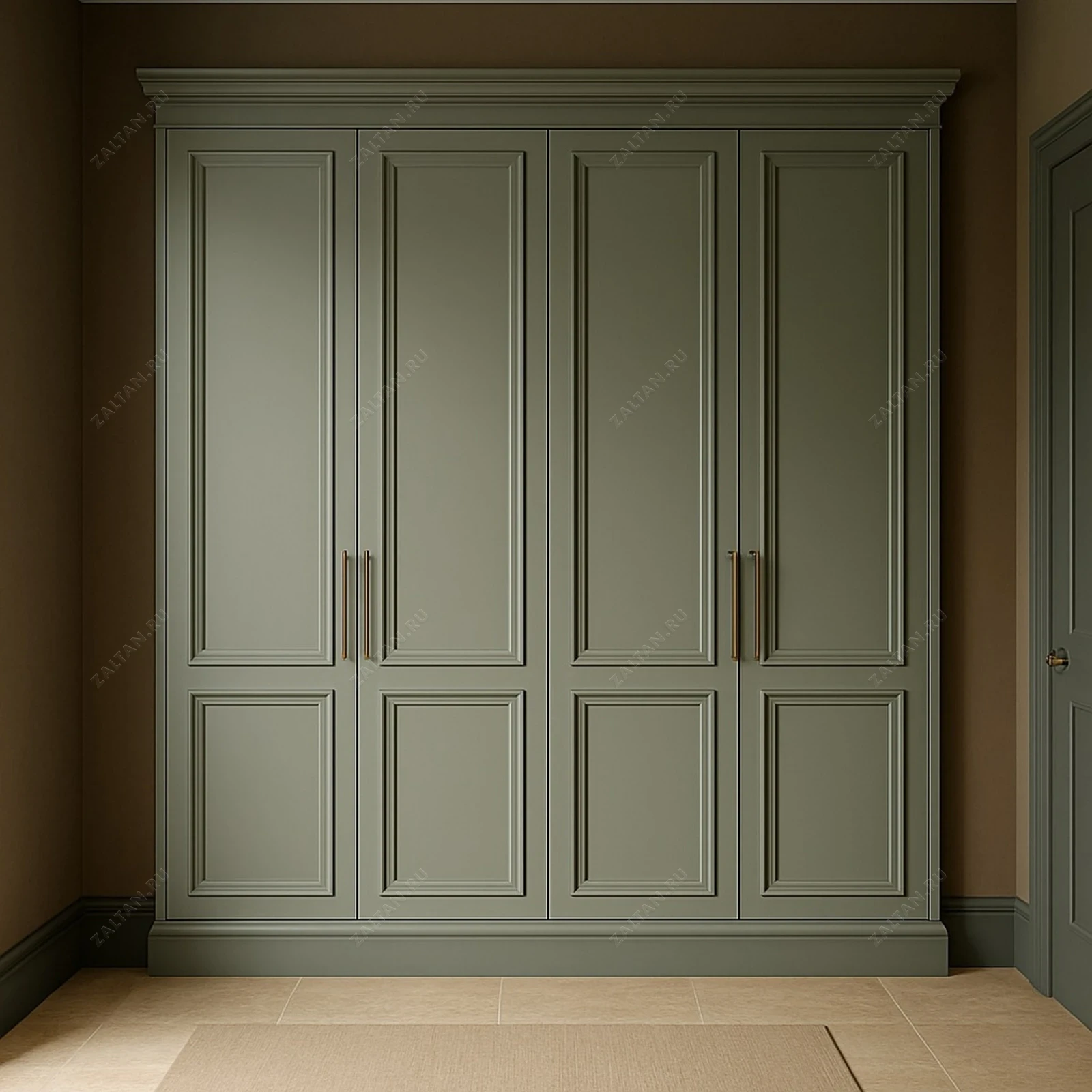 Распашной встроенный шкаф в неоклассическом стиле, выполнен из МДФ с качественной эмалевой покраской. Подходит для спальни — строгая геометрия фасадов, карниз и высокий цоколь создают цельный интерьерный образ.