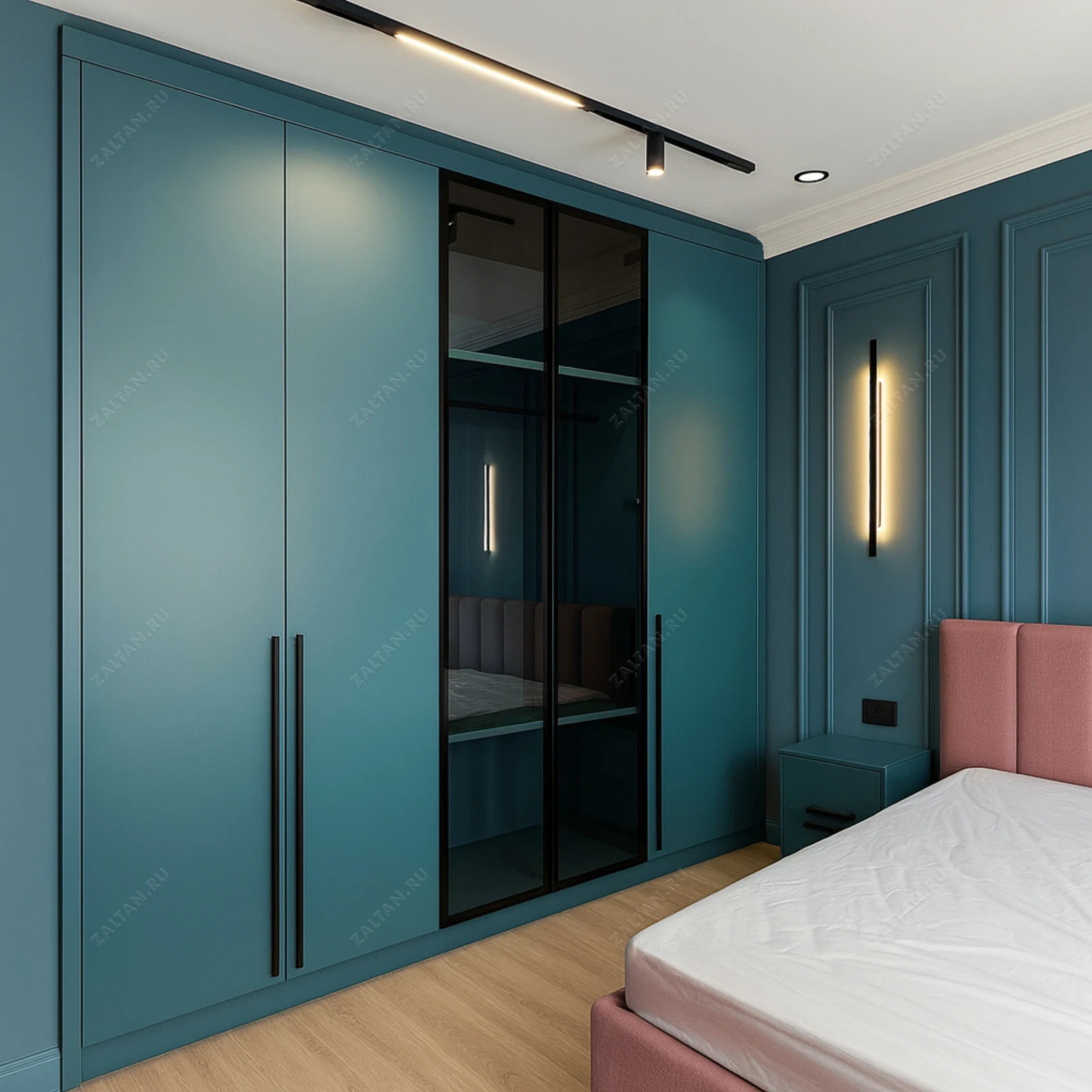 Элегантный распашной шкаф в спальню в матовом бирюзовом оттенке. Продуманная внутренняя планировка обеспечивает хранение одежды и белья, а центральные зеркальные дверцы визуально расширяют пространство.