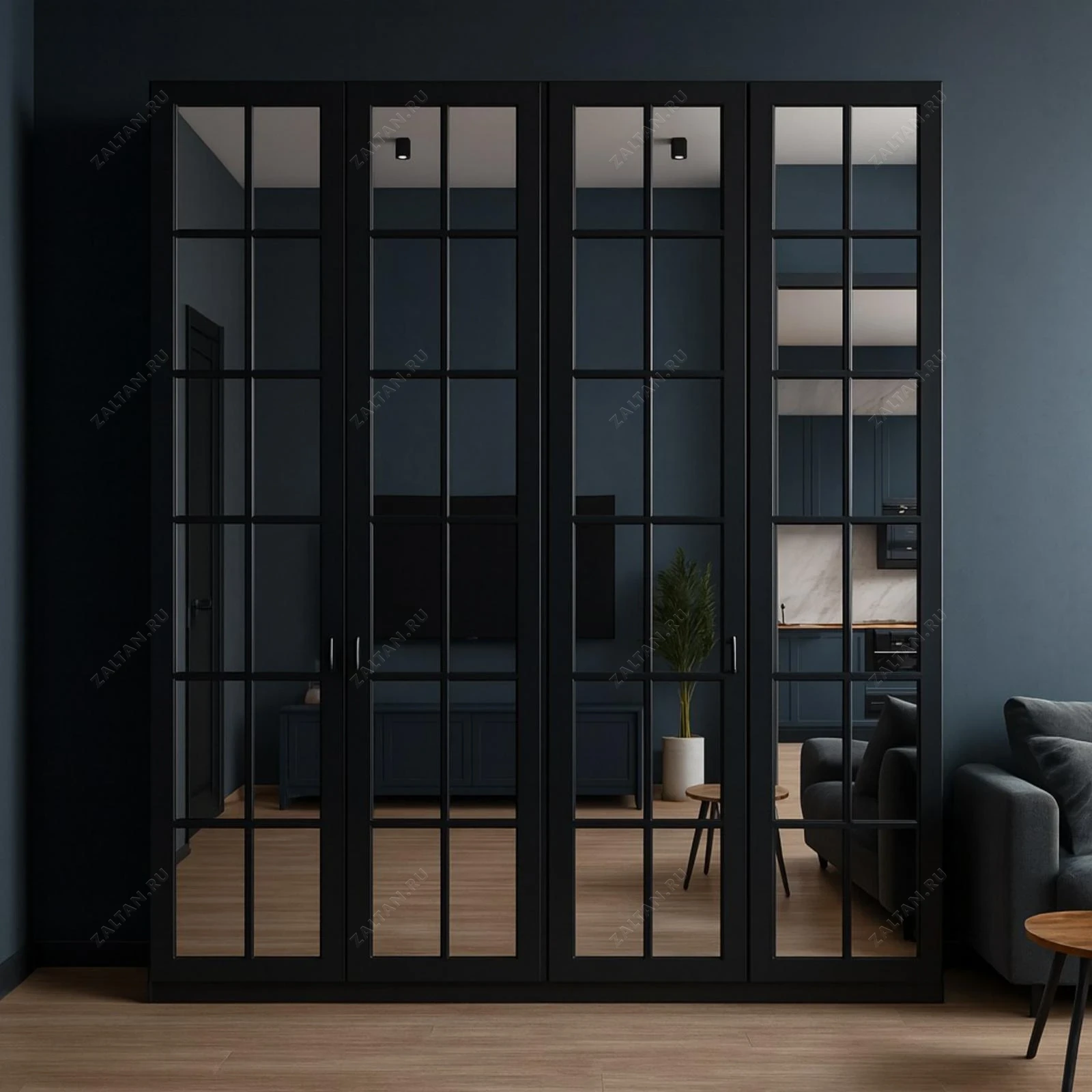 Элегантный распашной шкаф в лофт-стиле с зеркальными фасадами и чёрной раскладкой — идеальное решение для спальни или гостиной. Высокая конструкция «до потолка» визуально увеличивает пространство и обеспечивает много места для хранения.