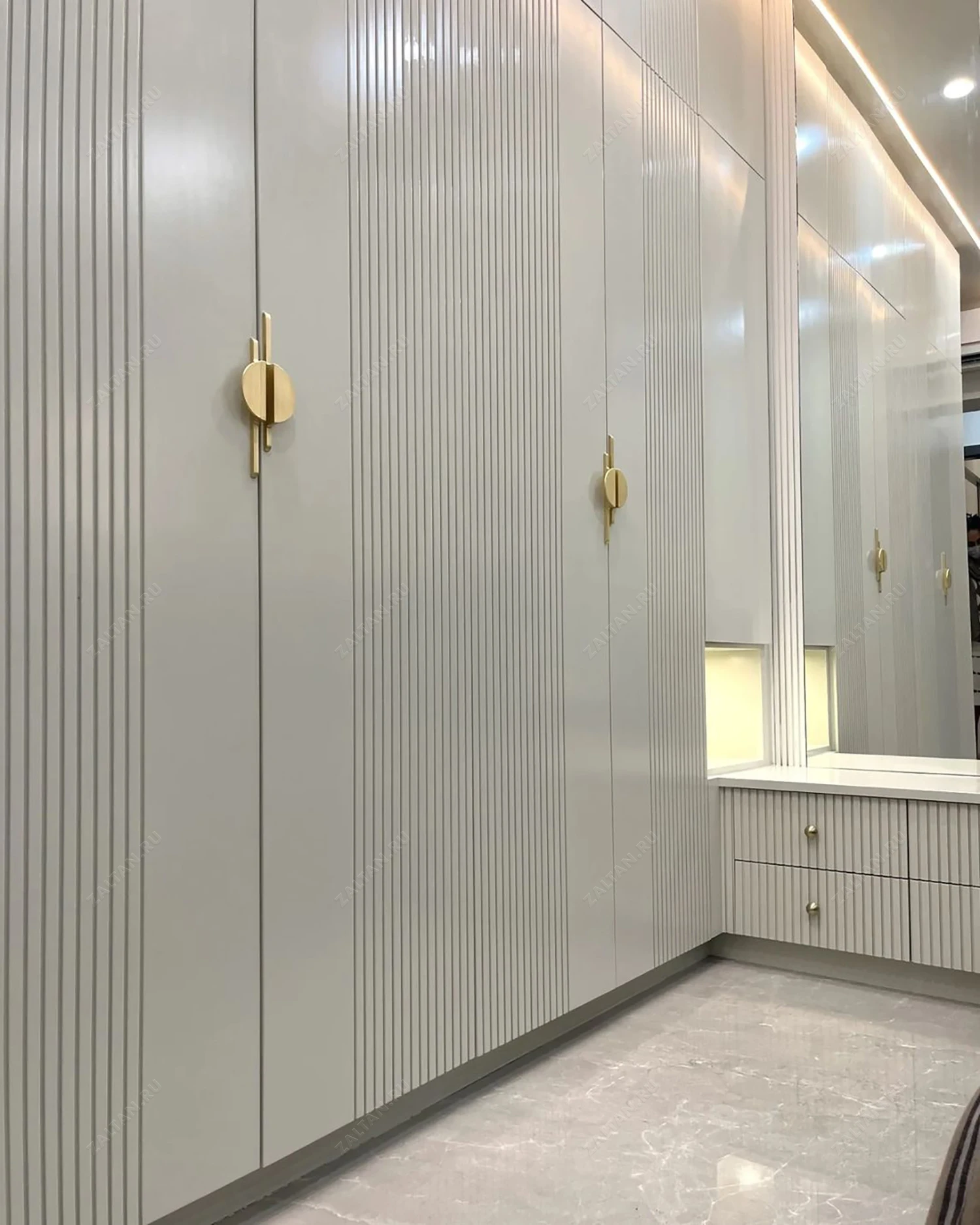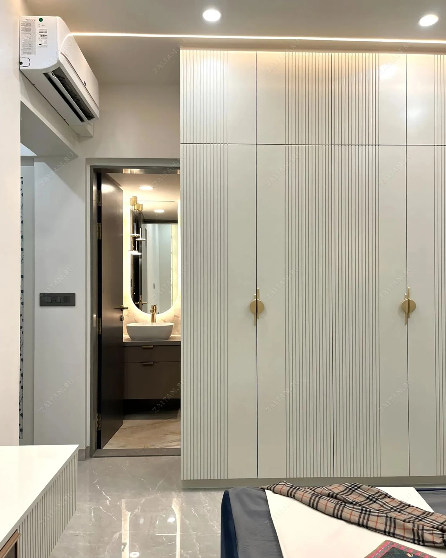 Элегантный шкаф Тубук с реечными дверцами, выполненный на заказ компанией ZALTAN. Этот корпусный распашной шкаф изготовлен из МДФ с фрезерованными фасадами, покрытыми качественной эмалью. Он установлен в спальню под потолок и оборудован антресолью для максимального использования пространства.