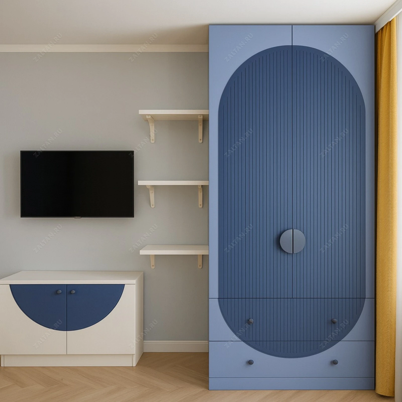 Элегантный корпусный шкаф в современном стиле с характерной реечной фасадной вставкой и арочным декоративным элементом. Изготовлен под индивидуальные размеры, на МДФ с матовой эмалевой отделкой — стойкое, премиальное покрытие. Внутри продуманная планировка: штанга для одежды, полки и выдвижные ящики.