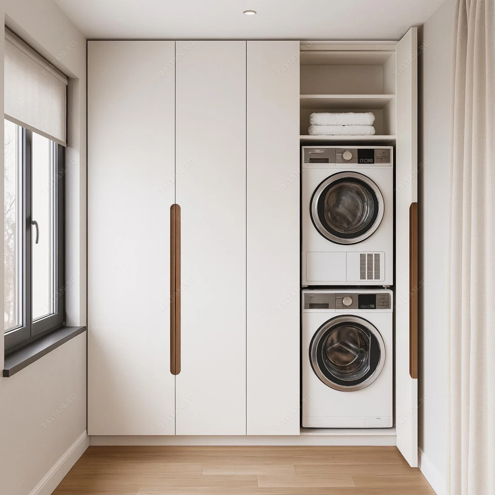 Шкаф на заказ для постирочной — премиальное решение для аккуратного размещения стиральной и сушильной машины. Выполнен по индивидуальным размерам с точной подгонкой ниши под технику и скрытыми интегрированными ручками.
