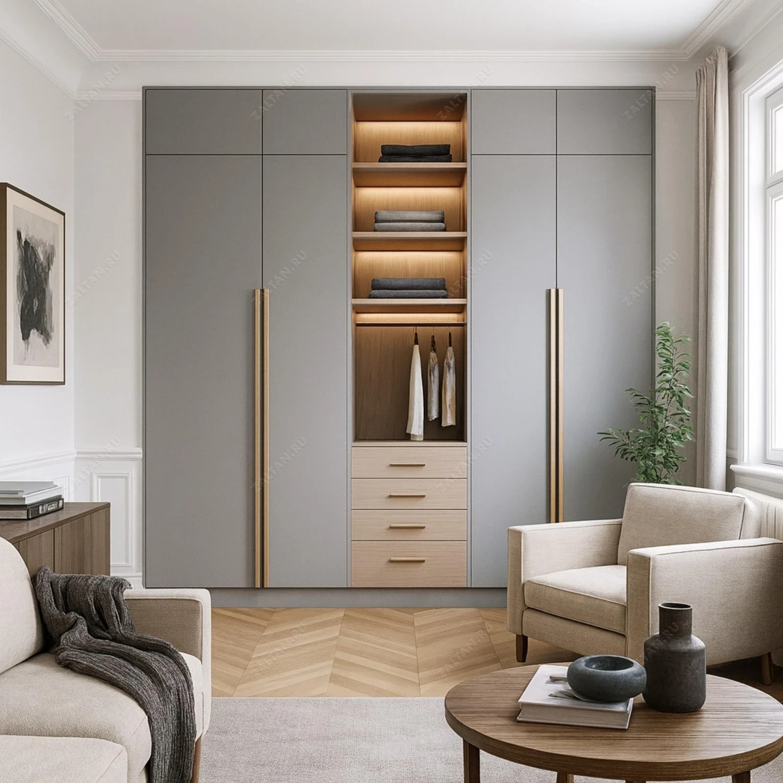 Элегантный встроенный шкаф-гардероб в матовом сером оттенке с тёплой деревянной нишей. Выполняется по индивидуальным размерам, с продуманной внутренней компоновкой: полки, штанга для одежды и выдвижные ящики.