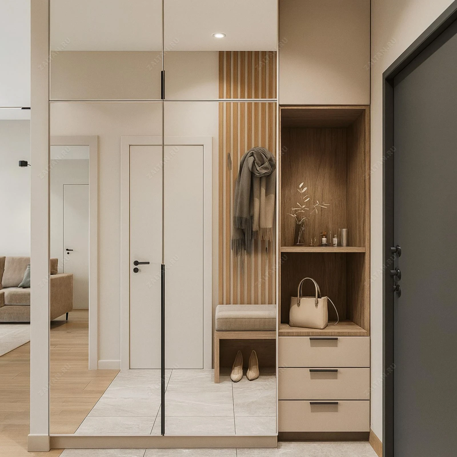 Элегантная мебельная композиция для прихожей: встроенный шкаф с полноразмерными зеркальными дверями и открытой нишей в тёплом деревянном декоре. Решение сочетает практичность и эстетику, оптимально для компактных входных зон.