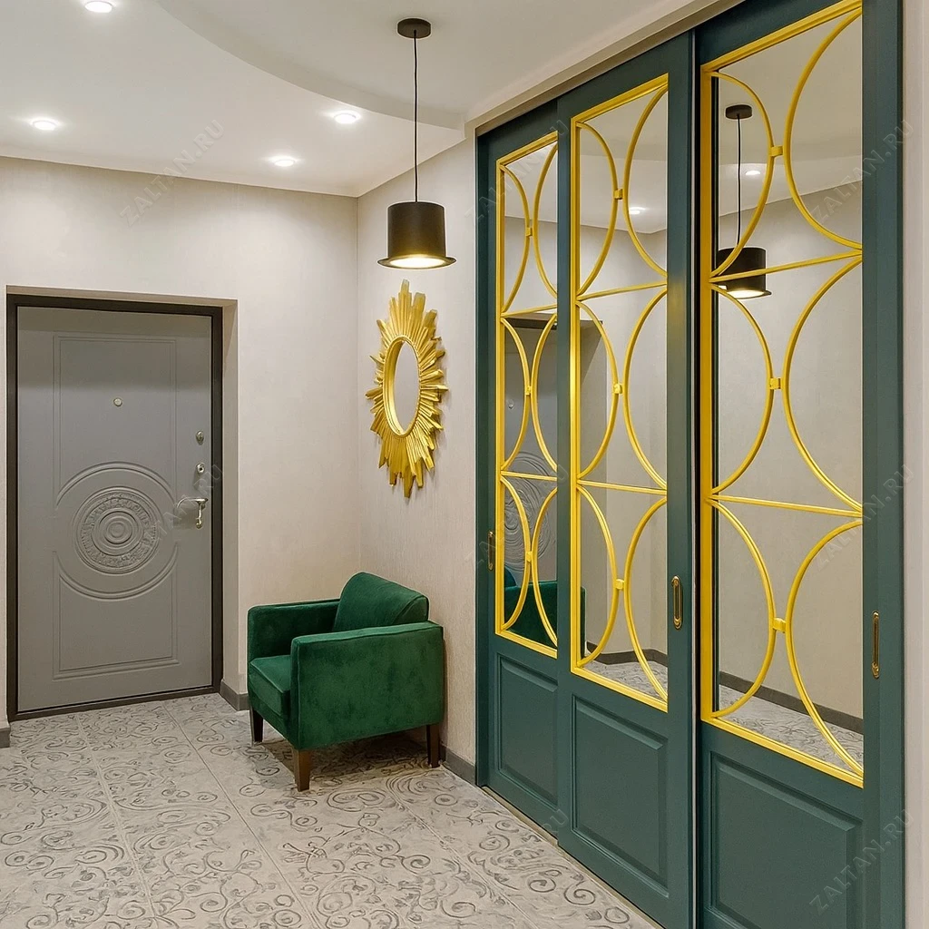 Шкаф-купе на заказ для прихожей: встроенная конструкция с зеркальными дверями и декоративной золотистой решёткой. Корпус выполнен из окрашенного МДФ, нижние вставки — филёнка, фасады — зеркало с алюминиевым профилем. Высокая точность подгонки и фурнитура премиум-класса обеспечивают плавное скольжение и долговечность.