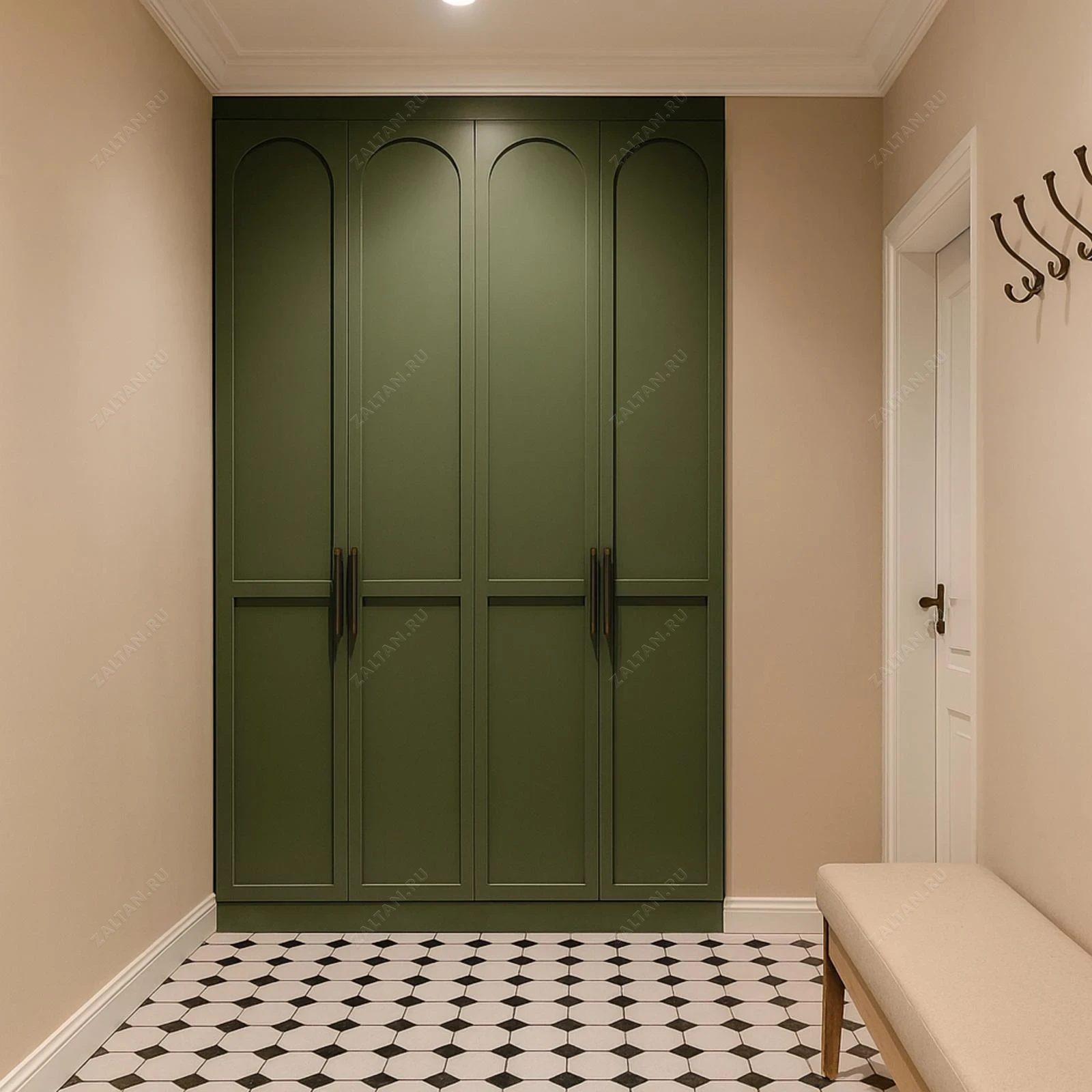 Элегантный распашной шкаф в прихожую из МДФ с эмалевым покрытием. Четыре двери с плавными арками сверху и горизонтальными фрезерованными линиями придают фасадам уникальный вид. Шкаф выполнен в глубоком матовом зеленом цвете. Черные ручки-скобы удачно гармонируют с общим дизайном. Идеальное решение для стильного и функционального интерьера прихожей.