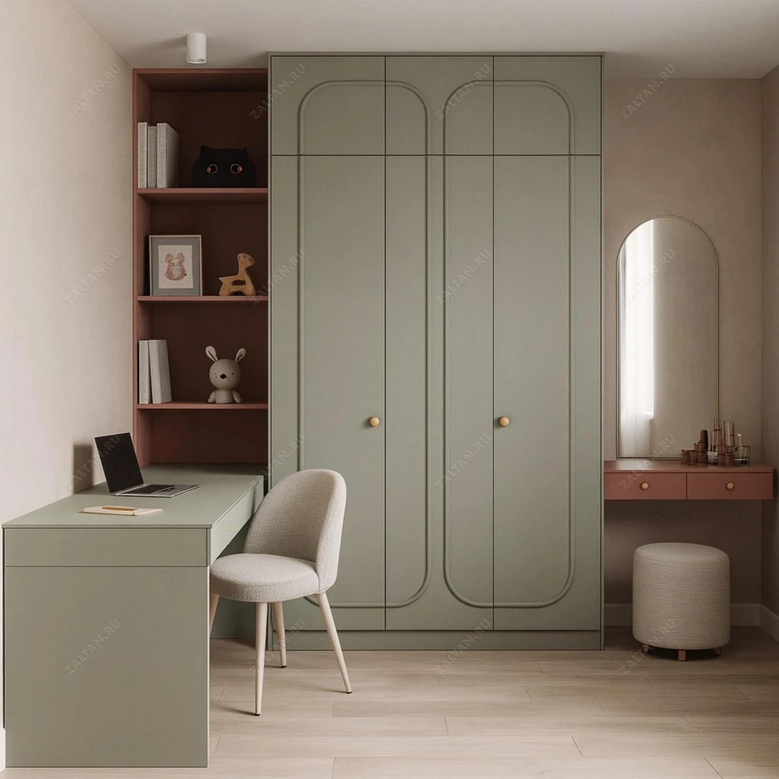 Индивидуальный шкаф с интегрированной рабочей зоной и туалетным столиком — решение для компактной спальни. Корпус из ЛДСП с фасадами МДФ под покраску, аккуратный фрезерованный декор и матовая поверхность создают премиальное впечатление.