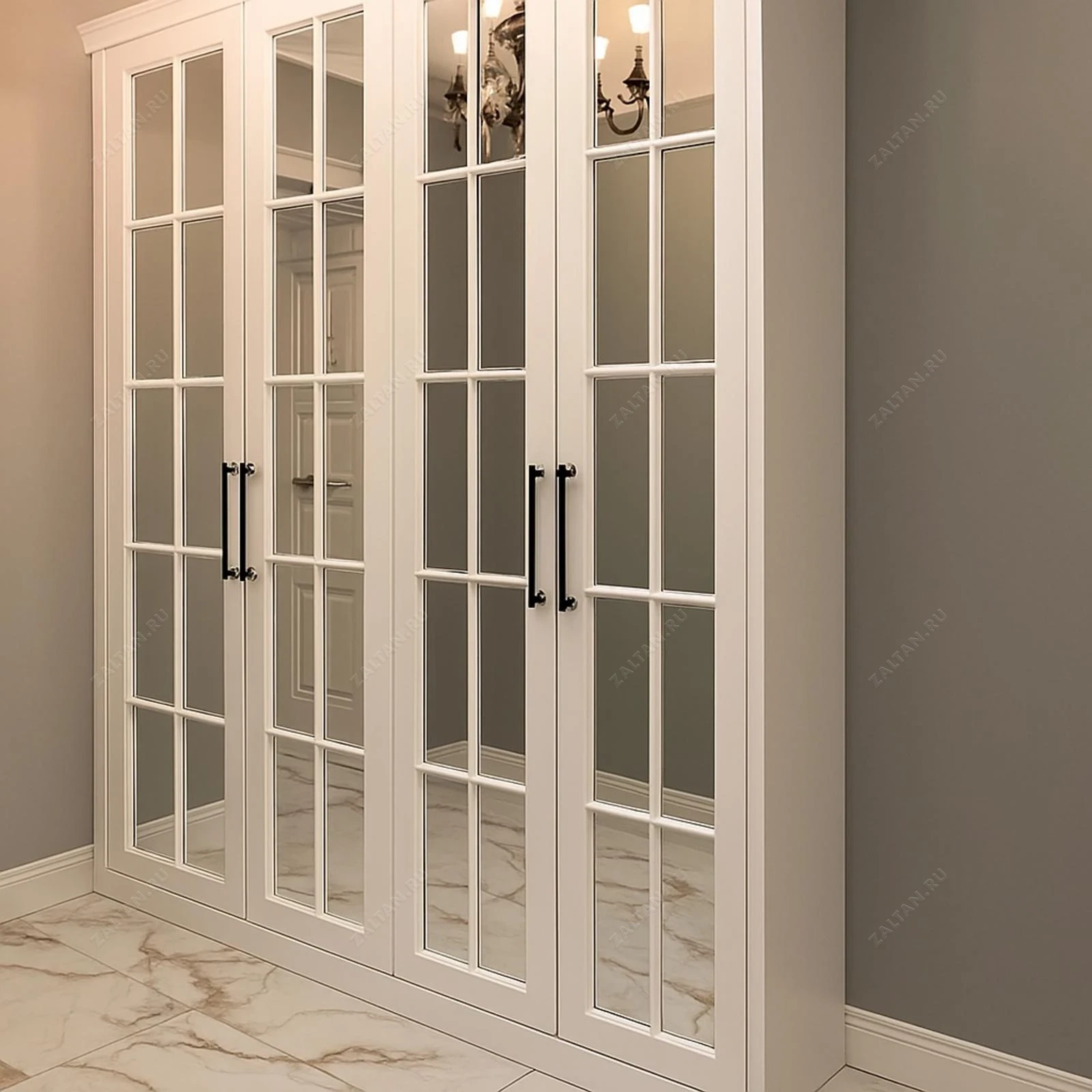 Элегантный корпусный шкаф с распашными витражными дверями. Выполнен в светлом матовом тоне, фасады — рамочные МДФ с крупными стеклянными секциями, стиль — неоклассика с лёгким прованс-акцентом.