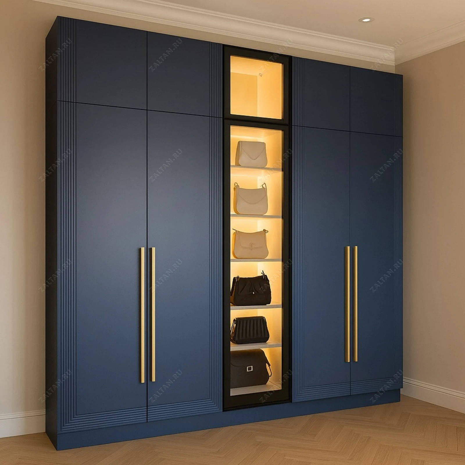 Элегантный корпусный шкаф в неоклассическом ключе: матовый синий фасад из крашеного МДФ, фрезерованные вертикальные каннелюры по кромкам и центральная витрина со стеклянными полками и тёплой LED-подсветкой. Длинные золотистые ручки создают выразительный акцент.
