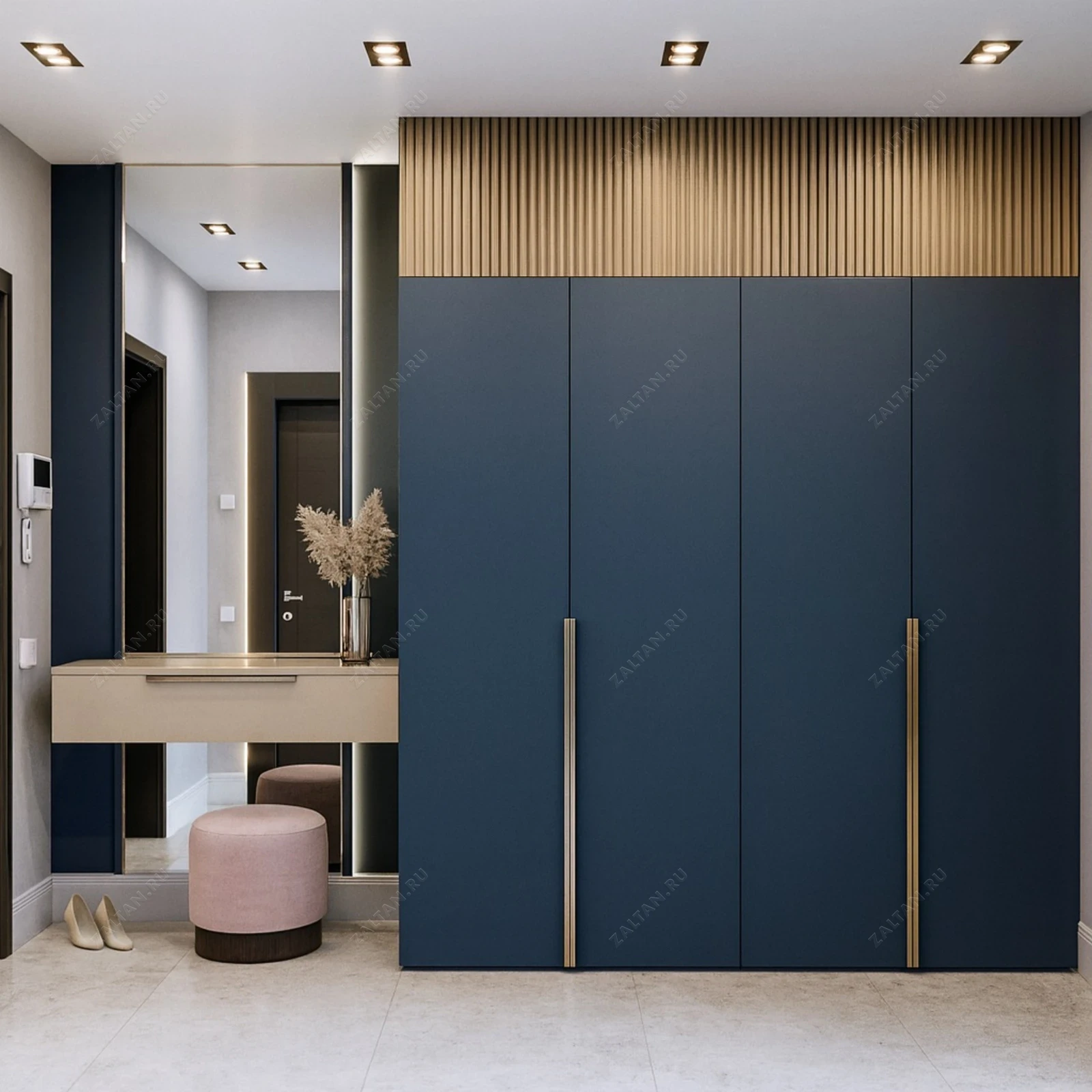 Элегантный встроенный шкаф для прихожей в современной стилистике. Фасады выполнены в матовой синей эмали на МДФ, верхняя рейка — декоративный реечный элемент из натурального шпона или массива оттенка «дуб». Длинные вертикальные ручки металлик придают ансамблю премиальный вид.