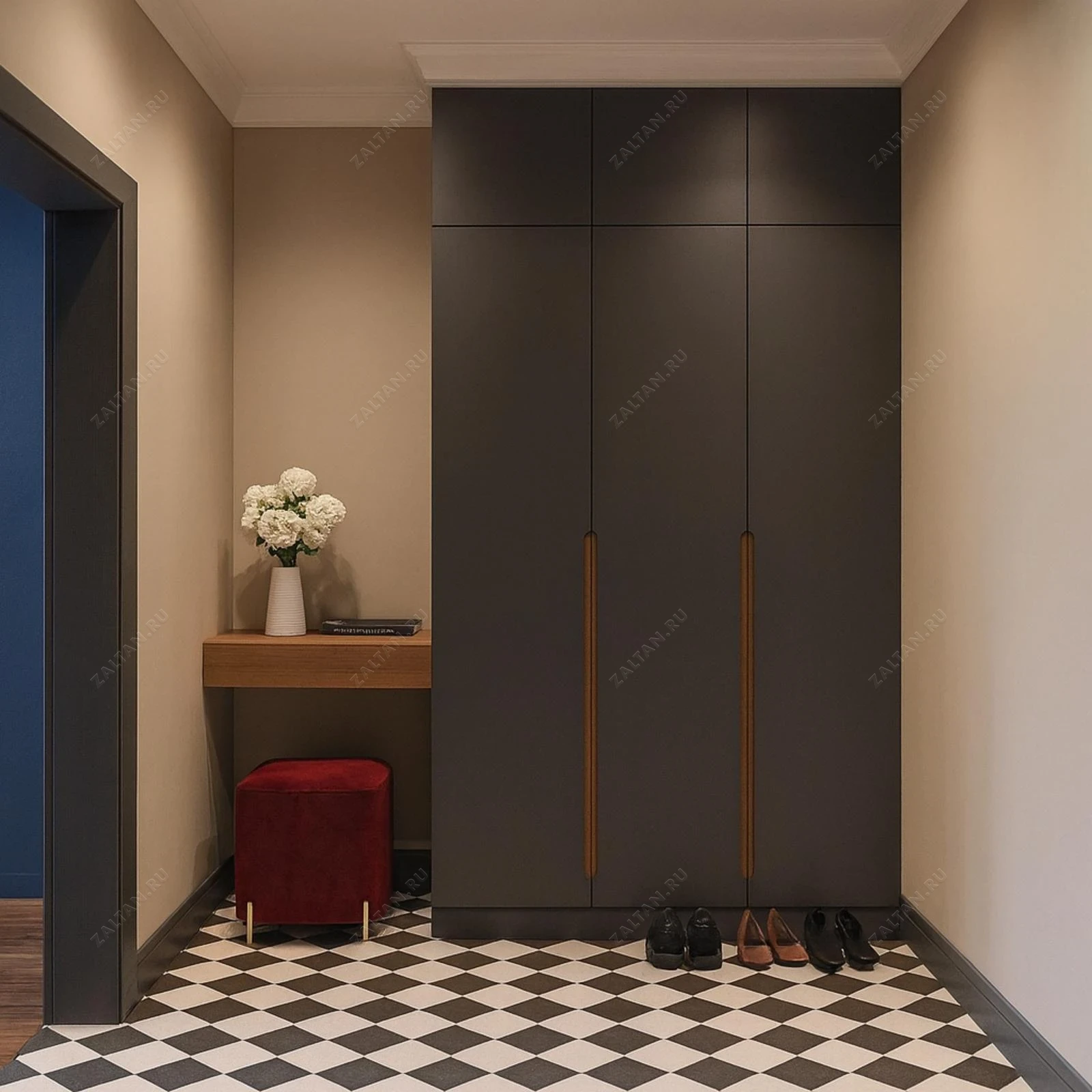 Конфигурация шкафа включает вместительное отделение для верхней одежды и антресольные секции для хранения сезонных вещей. Интегрированная консоль с выдвижным ящиком и пуф создают функциональное место для повседневных мелочей.