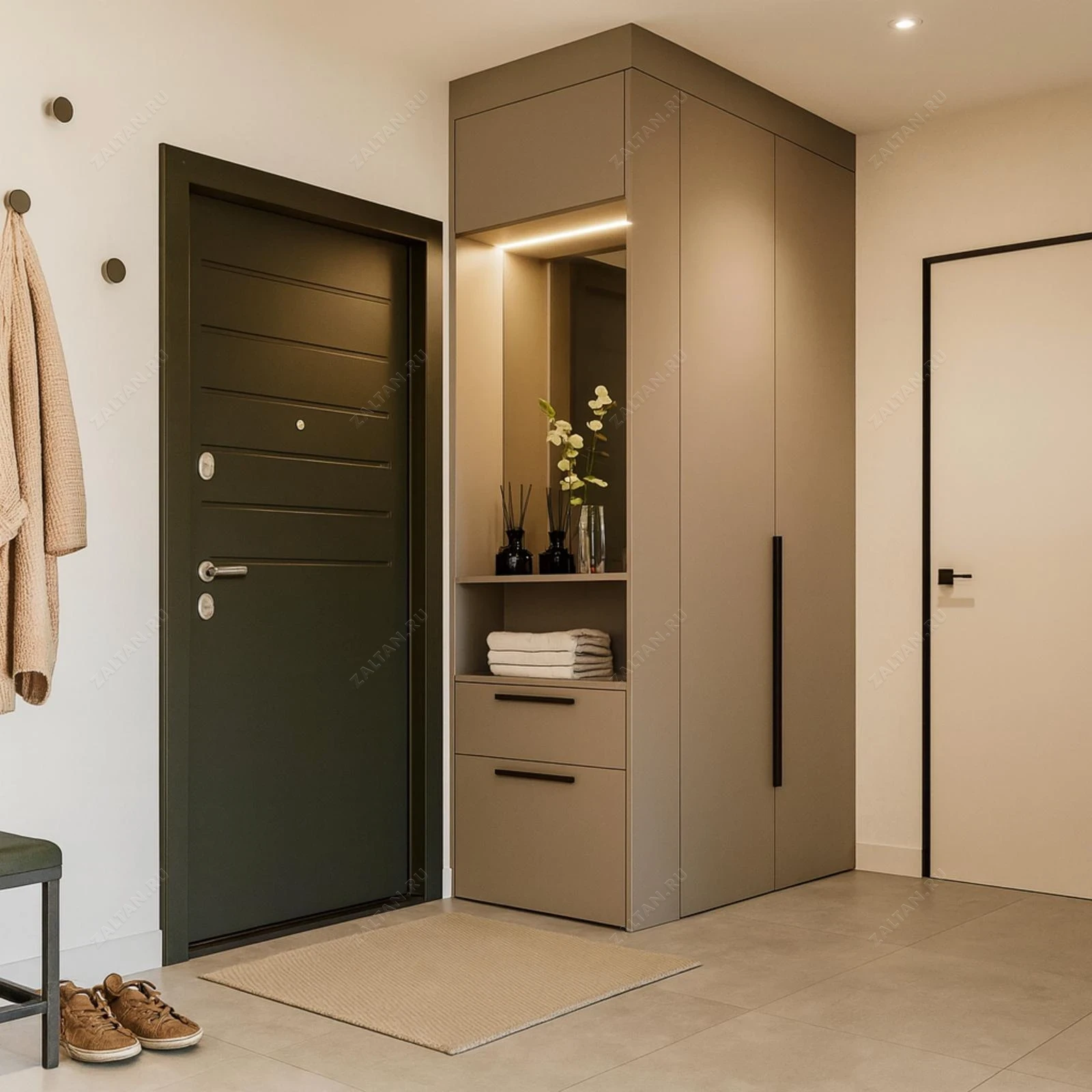 Элегантный корпусный шкаф для прихожей на заказ. Модель до потолка в спокойной бежево-серой гамме сочетает распашную секцию и открытую нишу с зеркалом и LED-подсветкой — практичное решение для компактного холла.