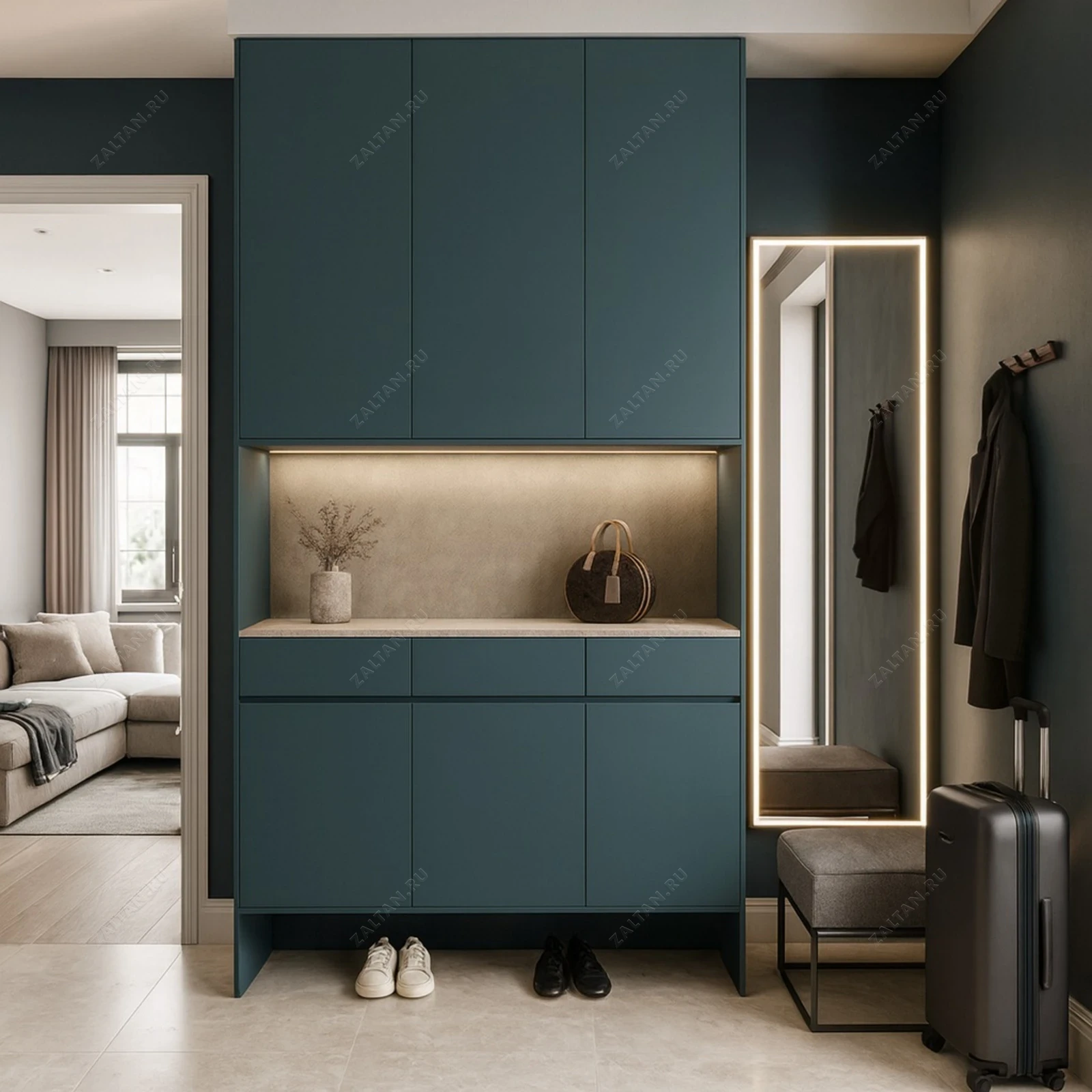 Функциональный шкаф для прихожей по индивидуальным размерам. Матовые фасады МДФ с эмалью, аккуратные бесшовные линии и встроенная подсветка ниши создают премиальный образ. Внутри — полки, выдвижные ящики и продуманная зона для обуви.
