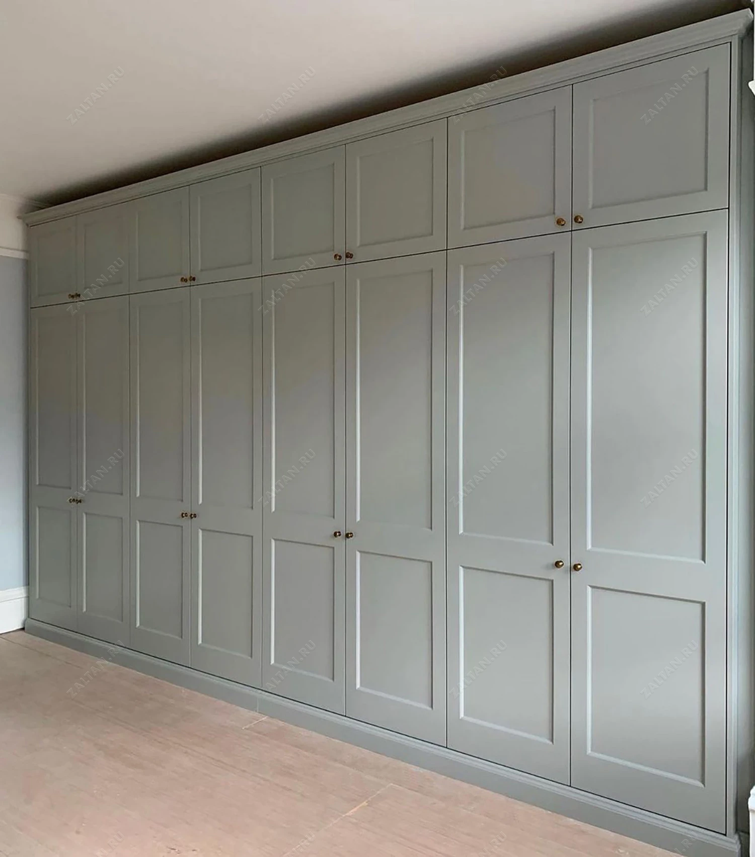 Большой каф для спальни Сильвер с распашными фасадами в классическом стиле. Он изготовлен на заказ по индивидуальным размерам компанией ZALTAN. Шкаф выполнен в изысканном сером цвете и установлен под потолок, занимая пространство от стены до стены. В верхней части конструкции добавлен декоративный карниз, что придает мебели завершенность и элегантность.