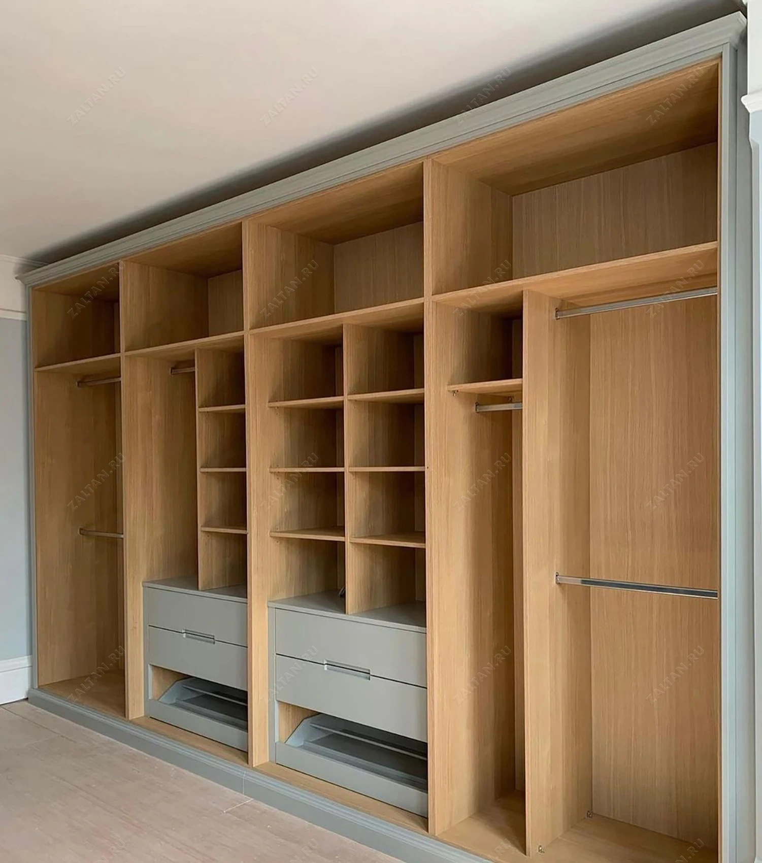 Внутри шкаф разделен на множество отделений и полок, что позволяет организовать хранение различных вещей. В конструкции предусмотрены: