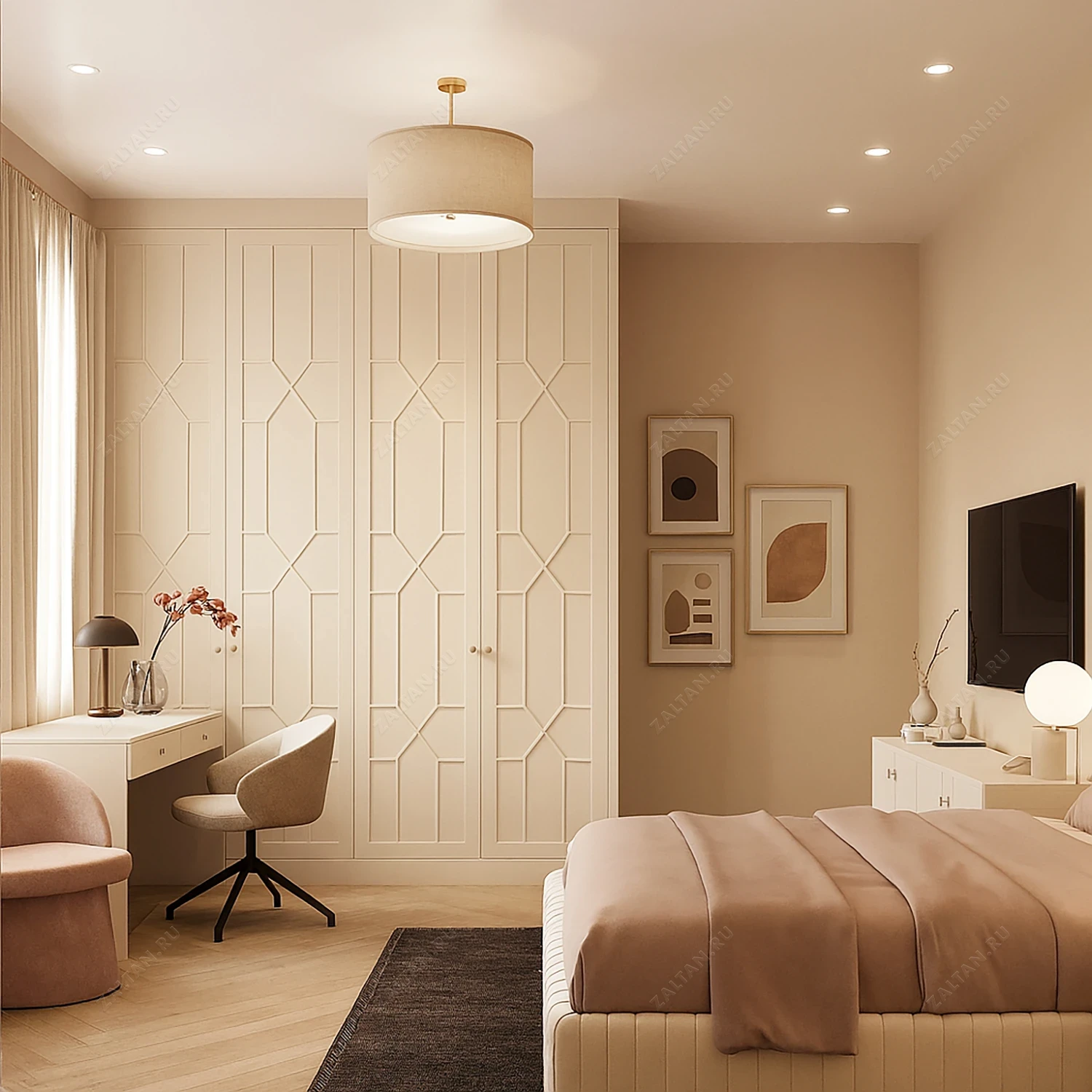 Шкаф в стиле неоклассика гармонично вписан в интерьер спальни, оформленной в тёплой бежевой гамме. Рядом со шкафом сделан небольшое рабочее место у окна. Фасады украшены геометрической фрезеровкой, подчёркивая элегантность пространства.