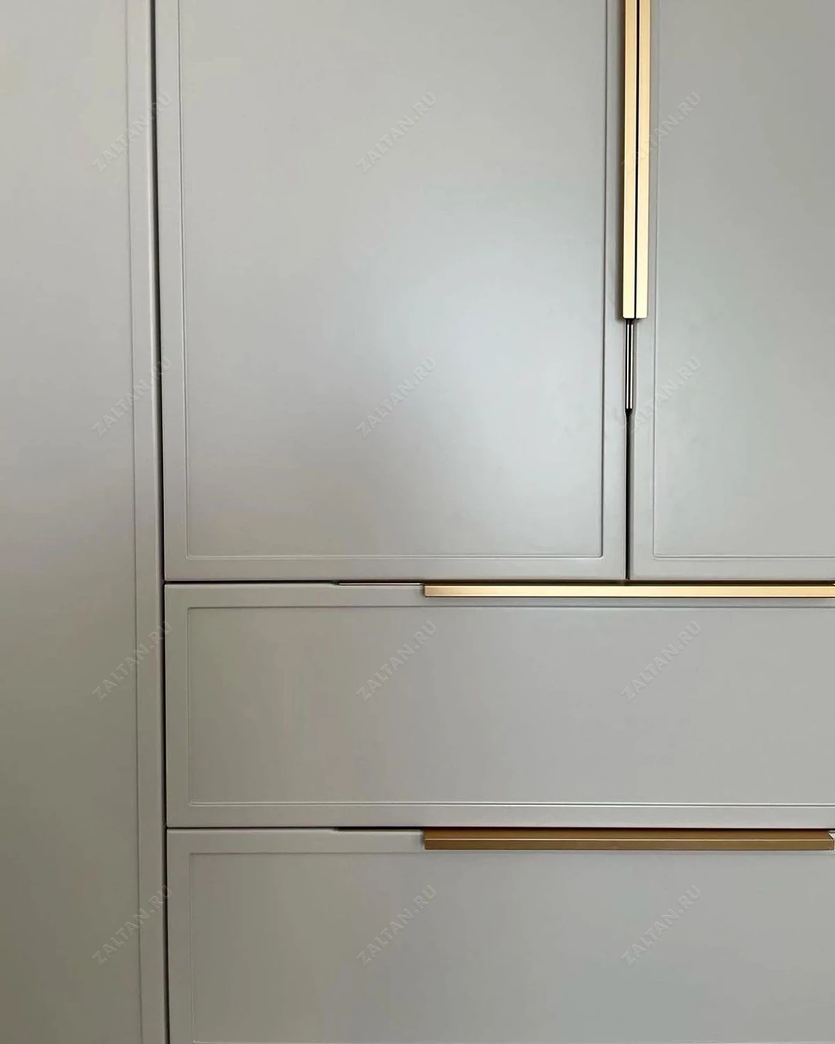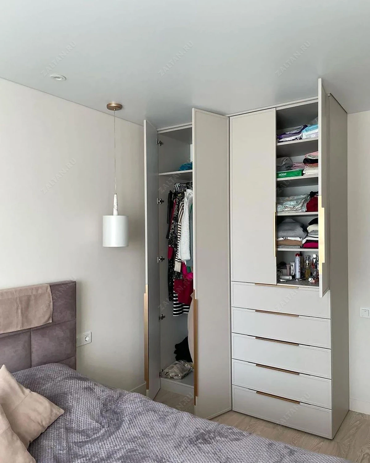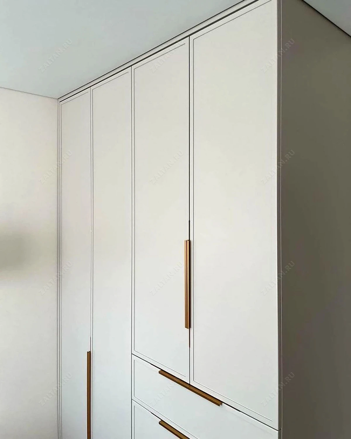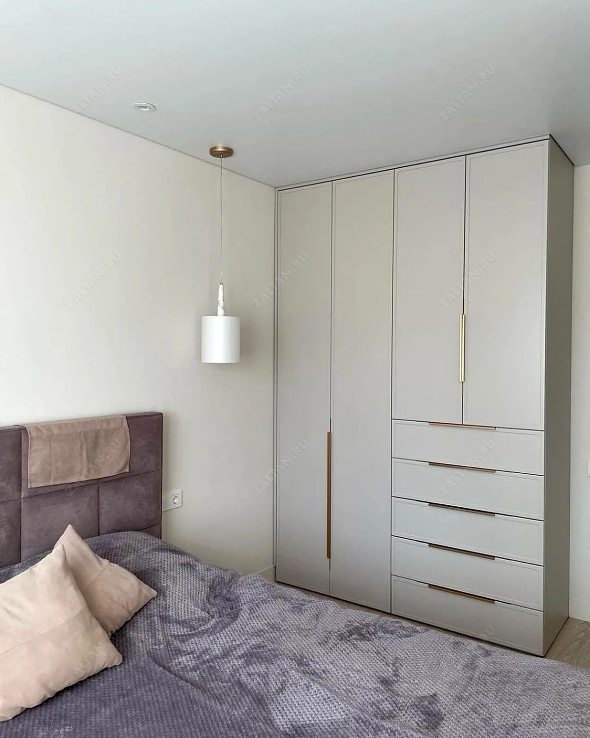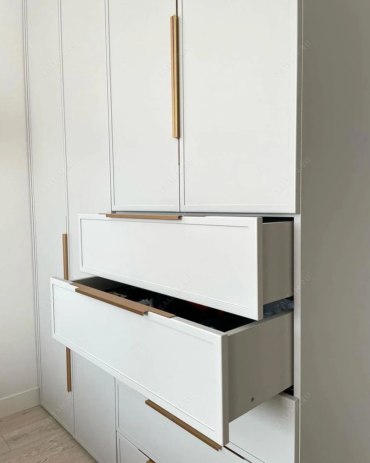 Распашной шкаф в спальню в современном стиле с фрезерованными минималистичными фасадами из МДФ под эмалью. В шкаф встроен комод с пятью выдвижными ящиками с фурнитурой Pulse с доводчиками. Ручки лаконичные профильные установленные с торца дверей. Шкаф отлично вписался в интерьер спальни и позволяет организовать в нем хранение вещей и белья.