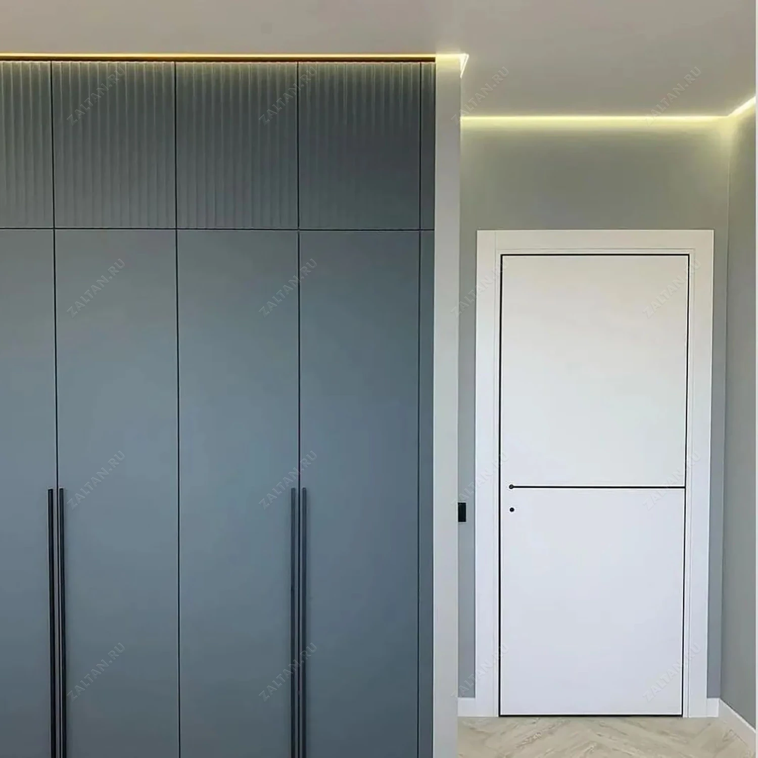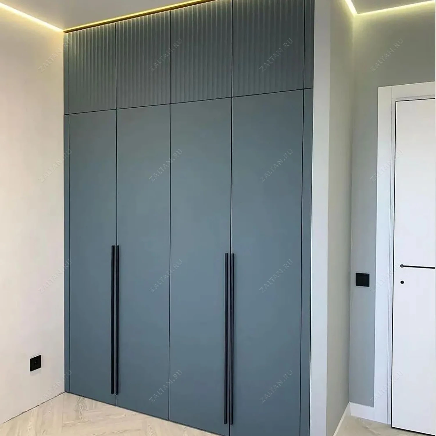 Встроенный распашной шкаф в детскую спальню Хинсо выполнен на заказ по индивидуальным размерам с фрезерованными антресольными фасадами из крашеного МДФ. Нижние дверцы открываются профиль ручками из чёрного алюминиевого профиля. Шкаф выполнен в скандинавском стиле - древесный цвет корпуса в сочетании с прямыми матовыми фасадами.
