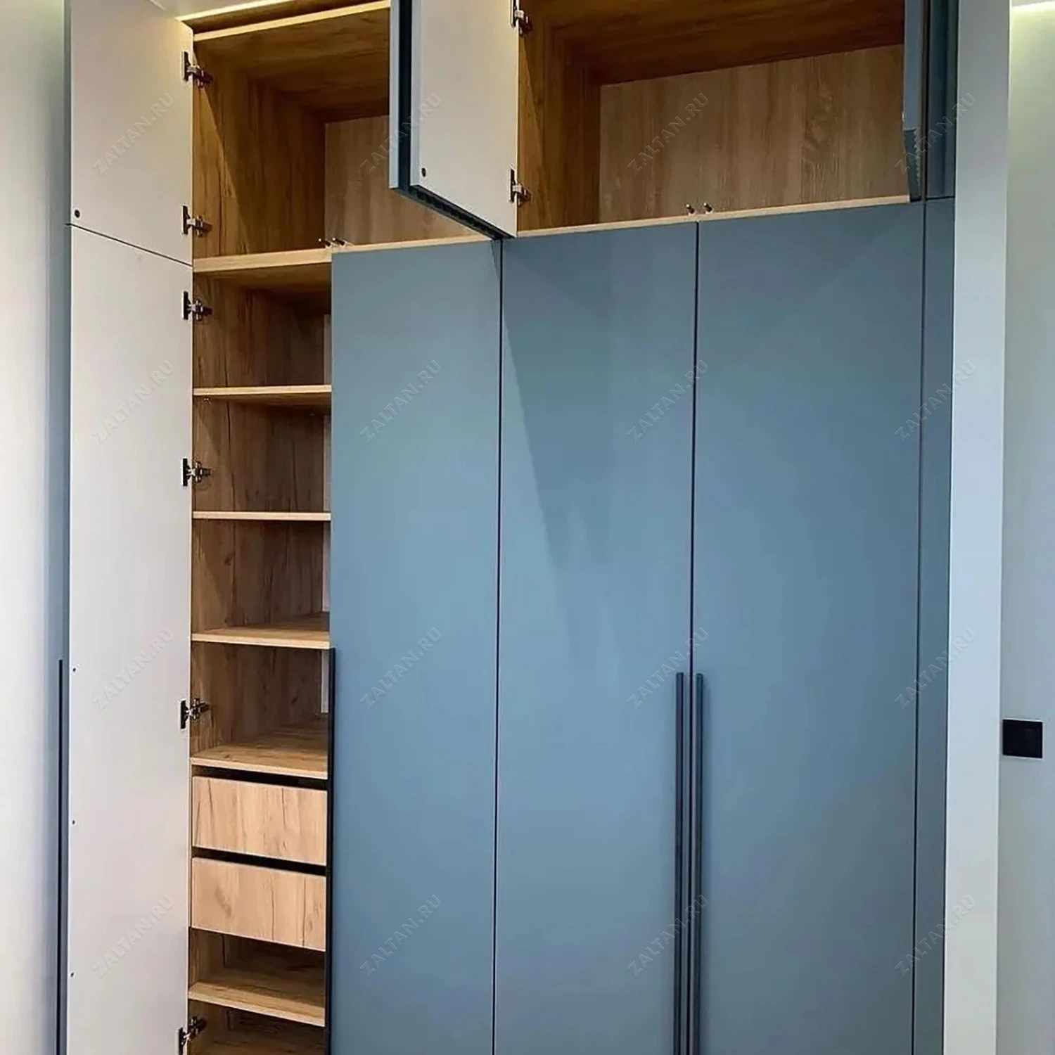 В шкафу используется фурнитура с доводчиками Pulse, верхний антресольный ряд открывается от нажатия. Внутри ящикаи плавного выдвижыения. Одежду хранят на вешалка на горизонтальных штангах в два уровня.