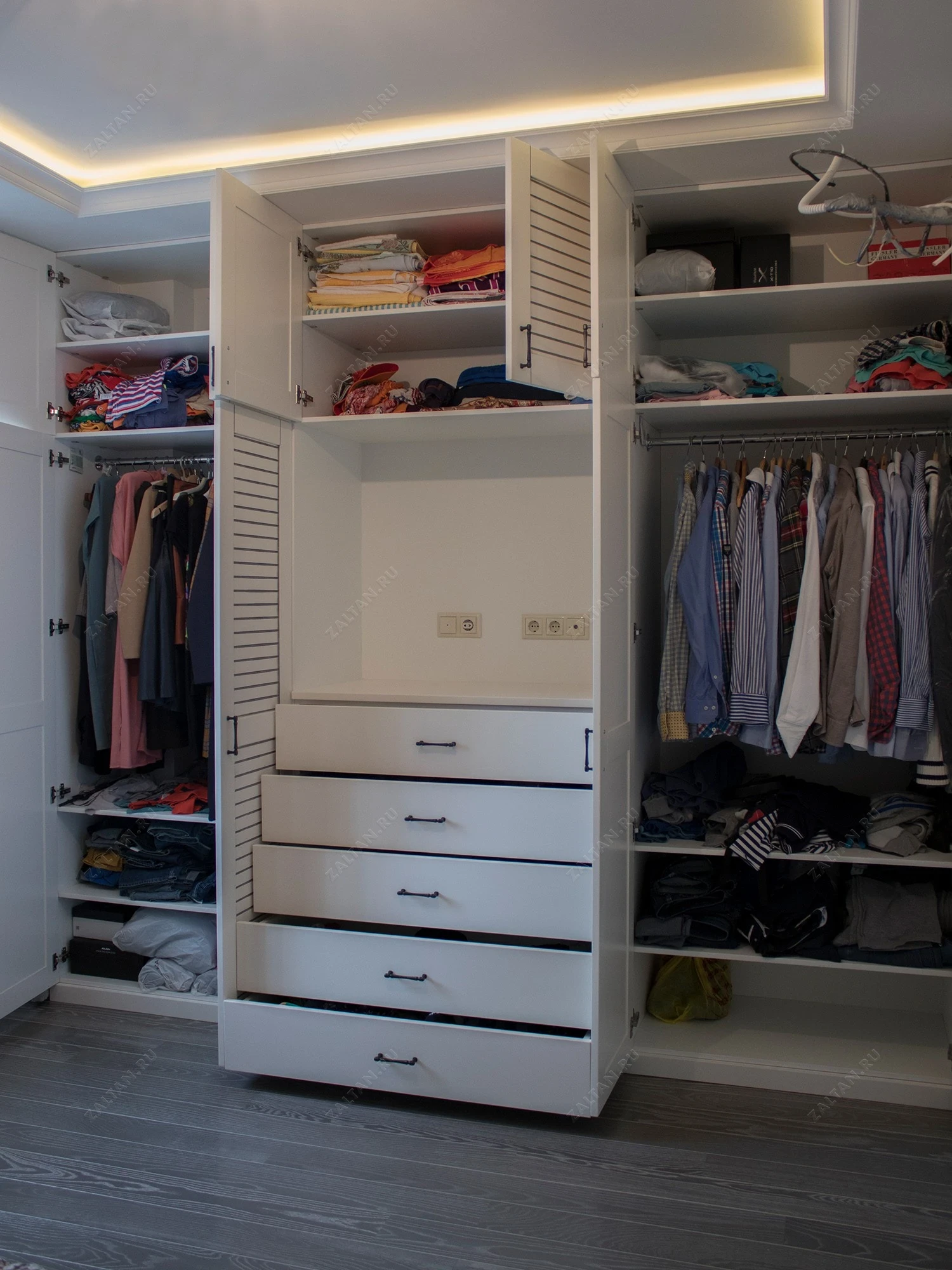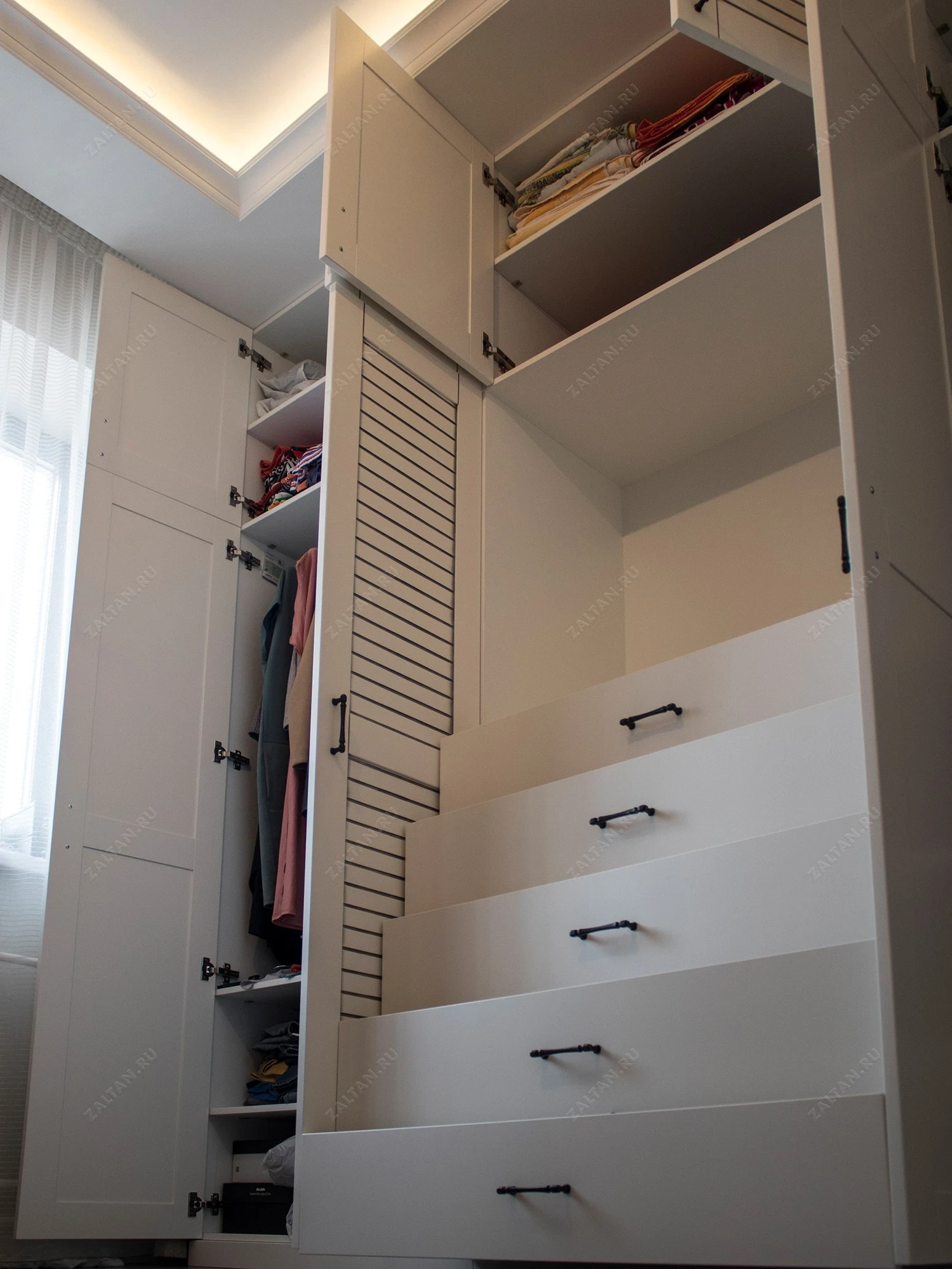 Внутреннее наполнение шкафа может быть спроектировано с учетом ваших индивидуальных потребностей. Вместительные полки и ящики позволяют аккуратно организовать хранение одежды, белья и аксессуаров. Ниша под телевизор является центральным элементом конструкции, обеспечивая идеальное место для вашего домашнего кинотеатра.