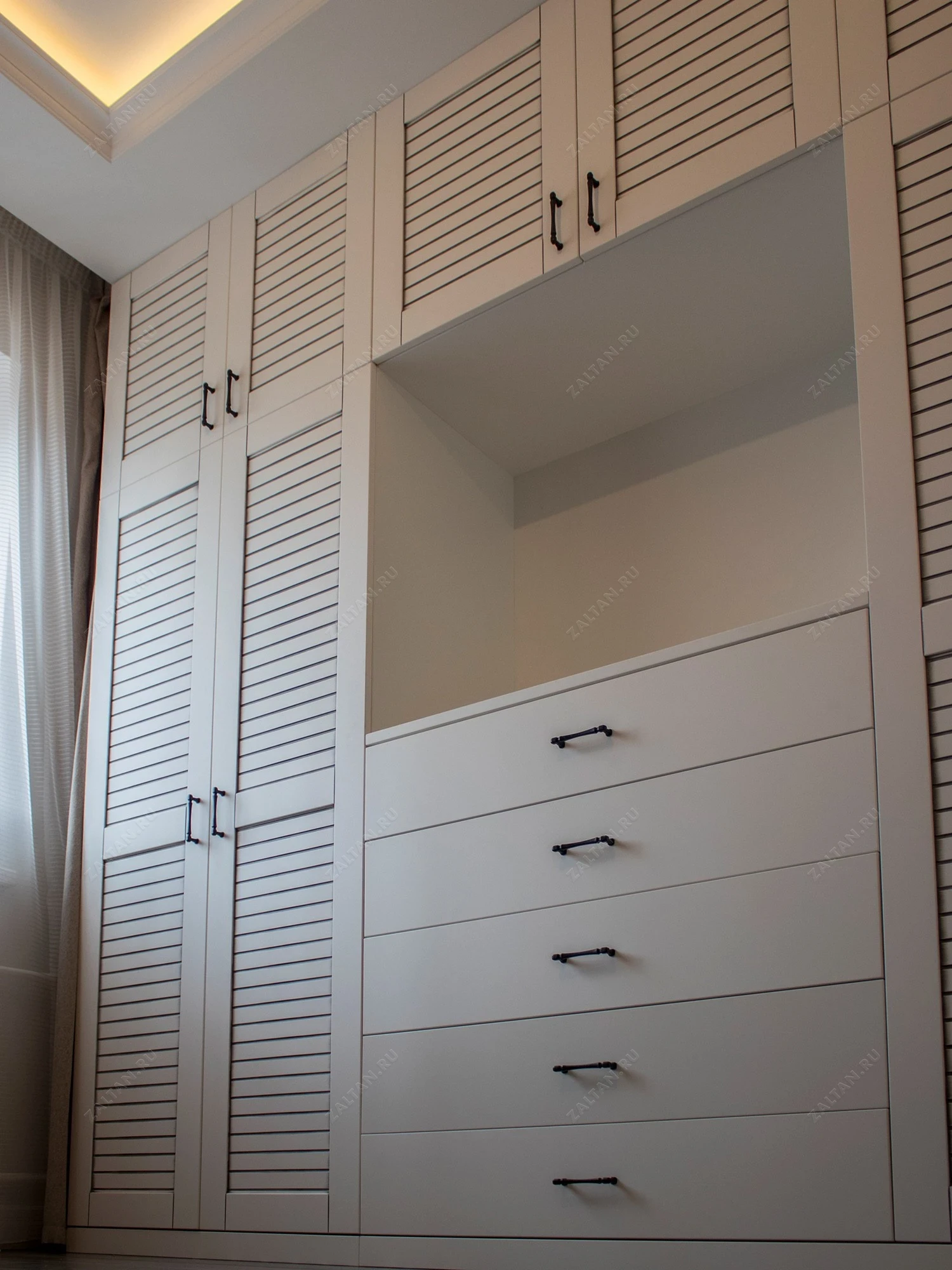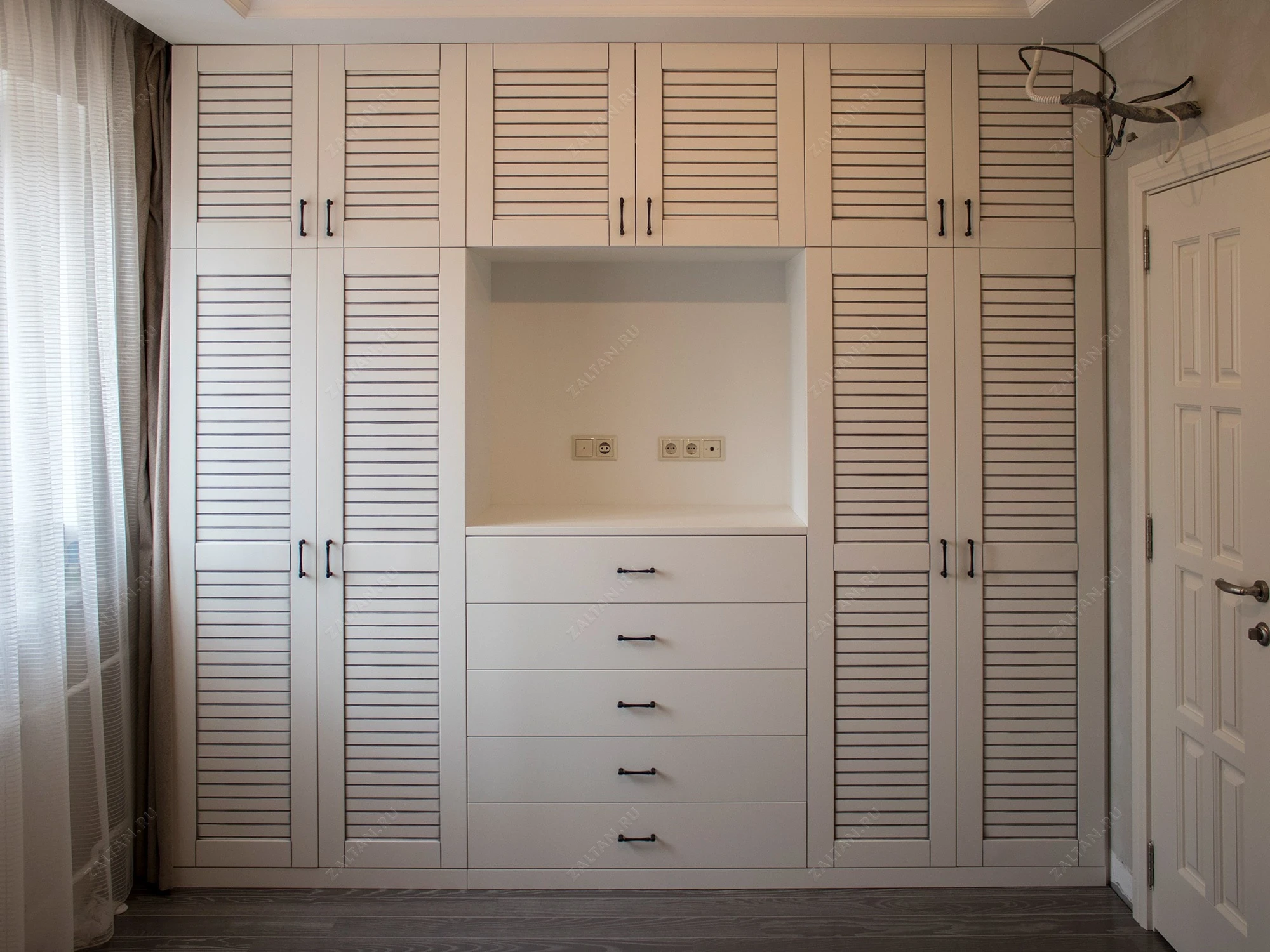 Встроенный распашной шкаф для спальни Уэлби с нишей под ТВ идеально сочетает в себе классическую эстетику и современные требования к функциональности. Фасады, выполненные в реечном стиле, добавляют легкости и воздушности интерьеру, при этом фрезеровка и патинирование дверей вносят в дизайн нотки роскоши и изысканности.