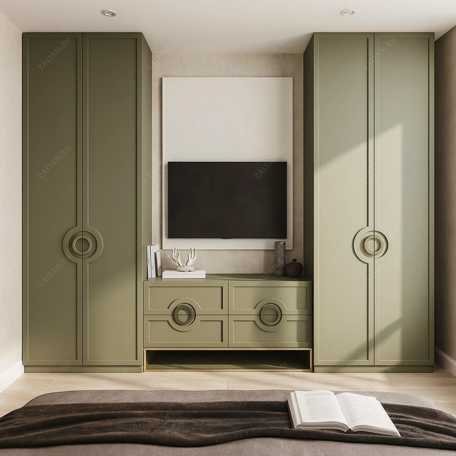 Элегантная корпусная композиция для спальни: два высоких шкафа и низкий комод под ТВ. Выполнена в матовой зелёной эмали на МДФ с рельефной фрезеровкой и декоративными кругами — стильное сочетание неоклассики и современности.