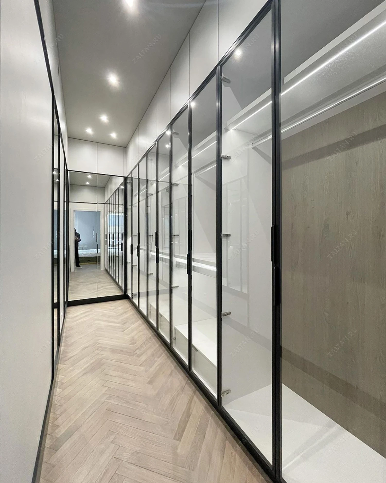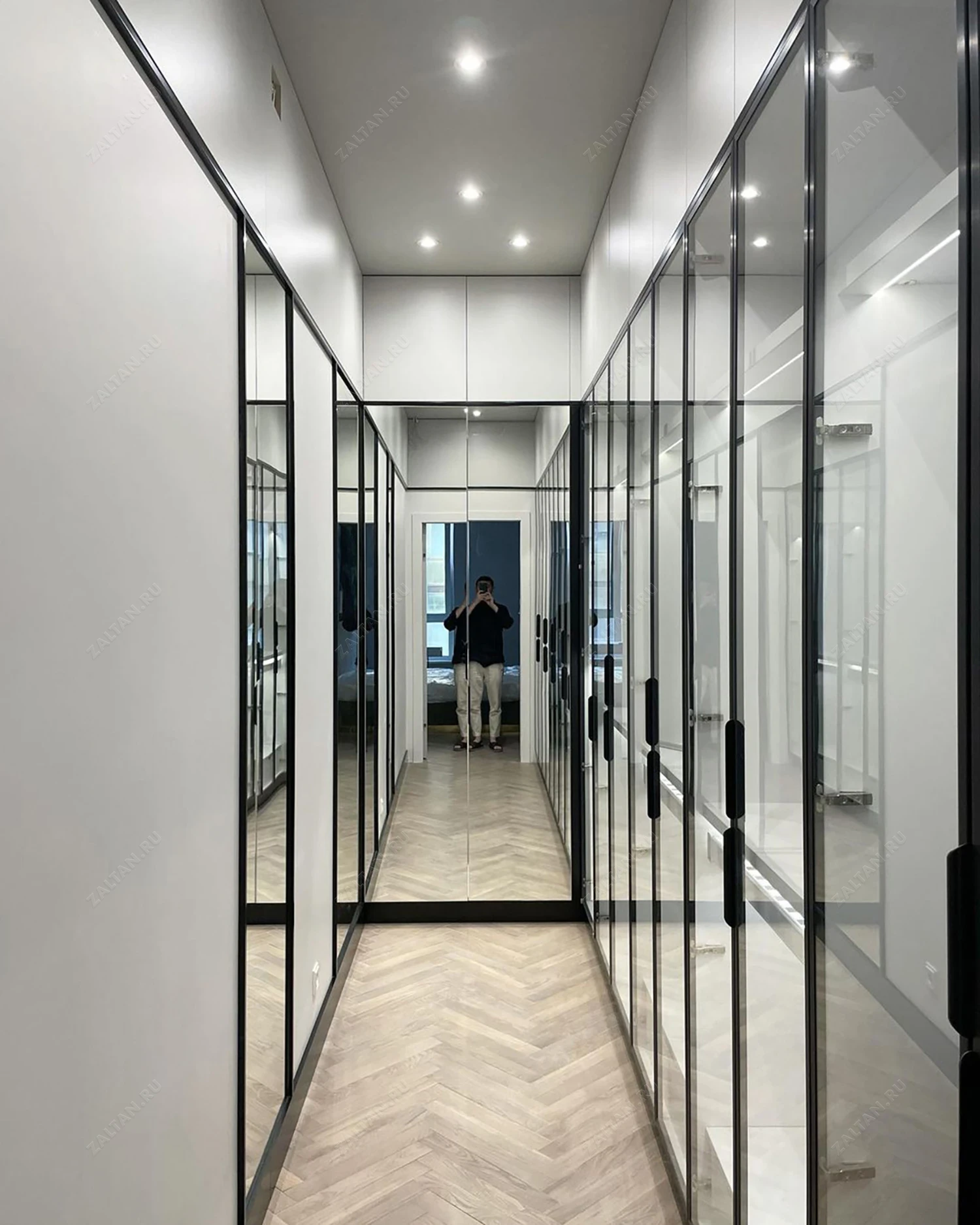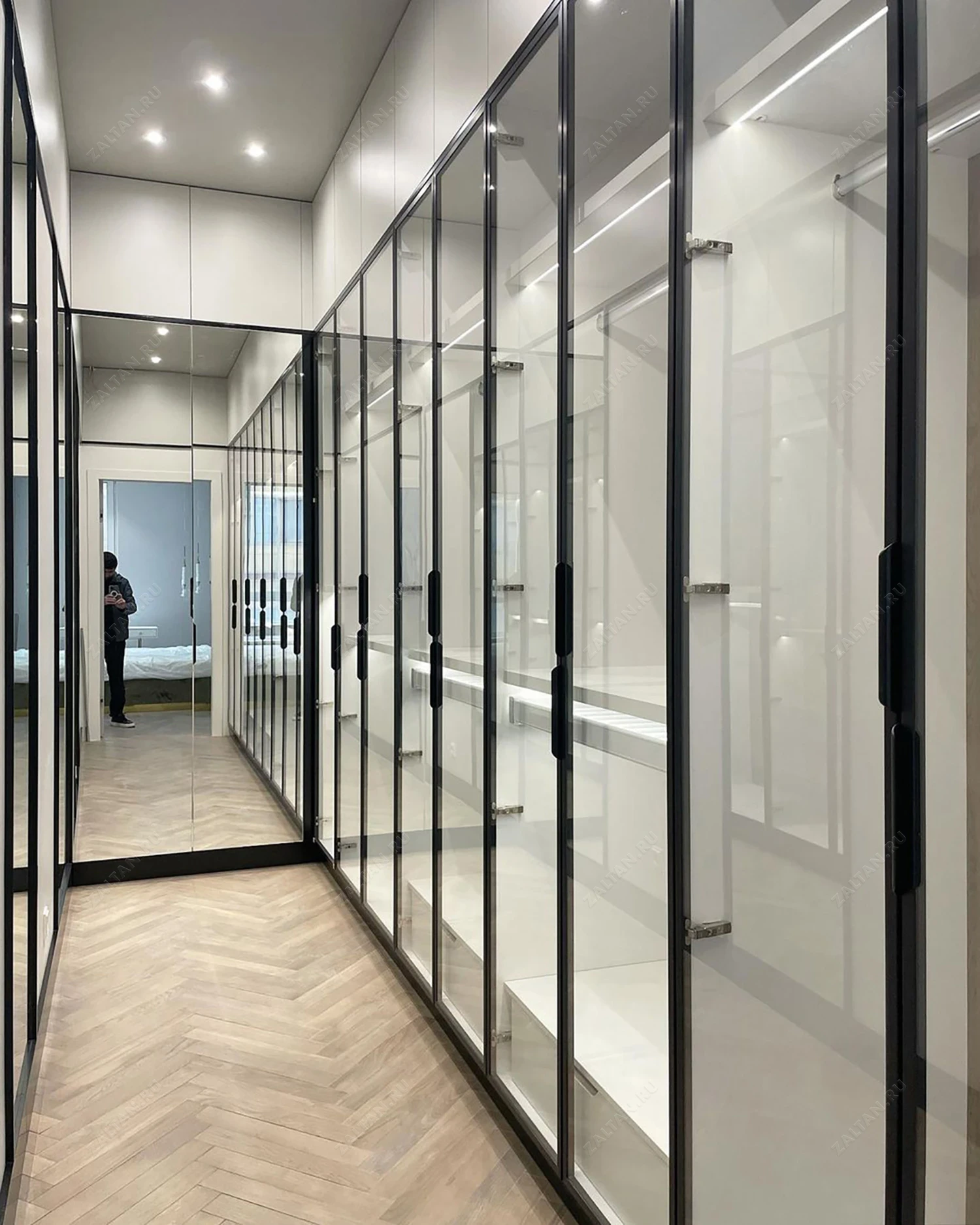 Гардеробная Prespa выполнена в П-образной планировке, что позволяет максимально эффективно использовать пространство. Дверцы из закаленного стекла в алюминиевом профиле придают гардеробной современный и изящный вид. Подсветка, встроенная в полки, не только обеспечивает удобство использования, но и создает атмосферное освещение в комнате.