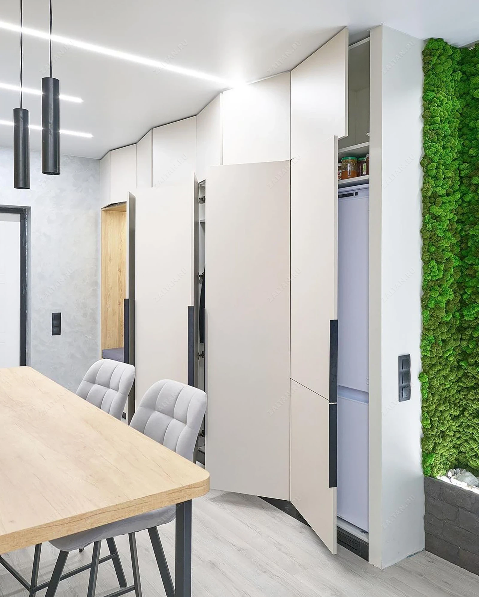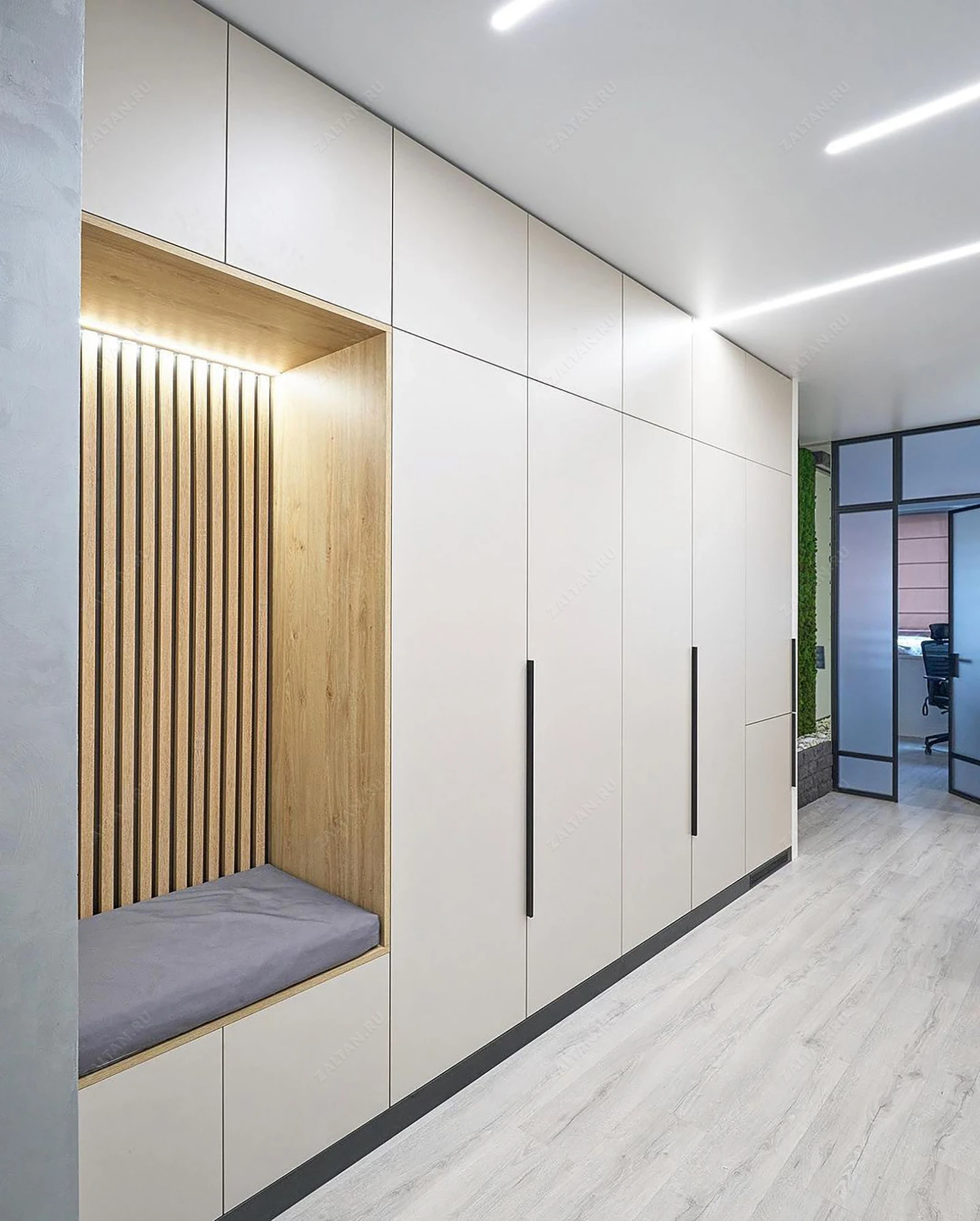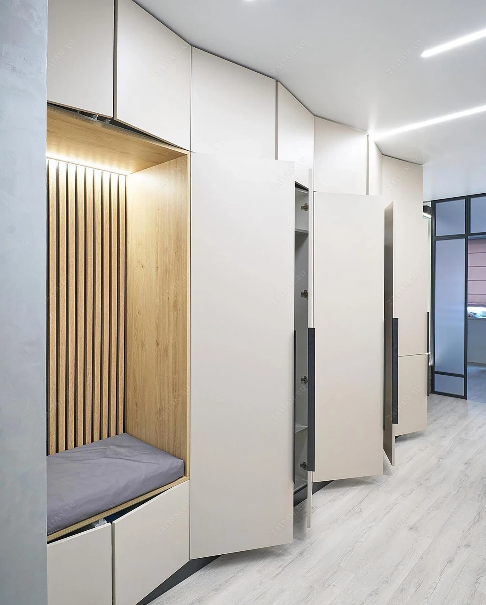 Прихожая Карде по индивидуальному дизайну изготавливается на заказ по Вашим размерам. В данной модели гладкие матовые фасады из крашеного МДФ под эмалью. Отделана под дерево открытая зона в прихожей. В краней секции установлен холодильник. Шкаф в комнате студии одновременно и прихожая, и зона хранения.
